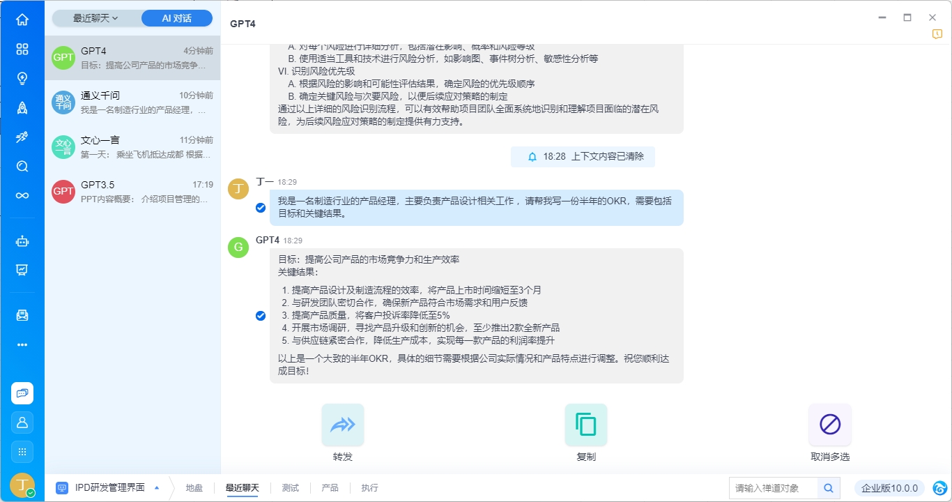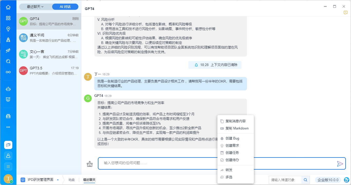 单条对话消息支持右键操作,包括复制、创建Bug、创建需求、创建任务、创建文档、转发至会话、多选。