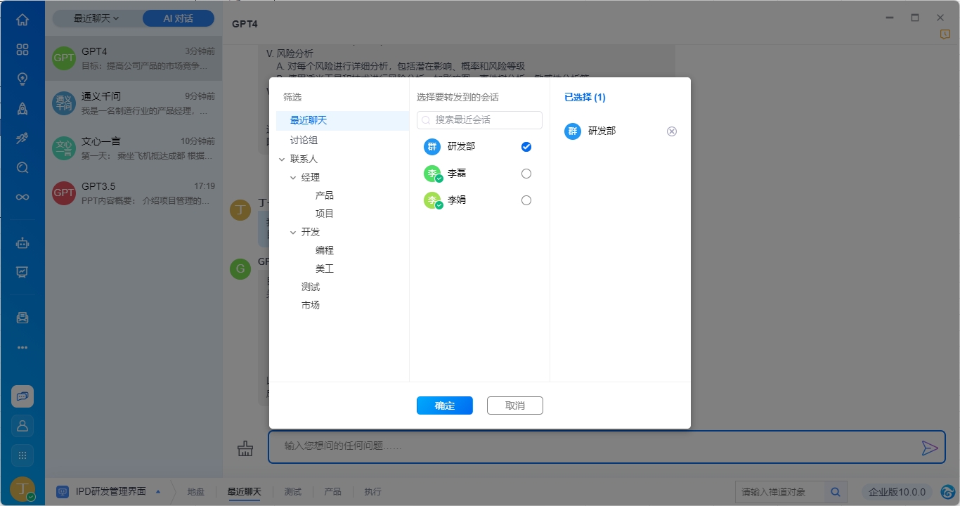 禅道后台配置语言模型并开启AI对话的权限后,客户端最近会话列表顶部显示【最近对话】、【AI对话】的标签,支持切换。同时最近对话支持下拉切换讨论组和私人会话。