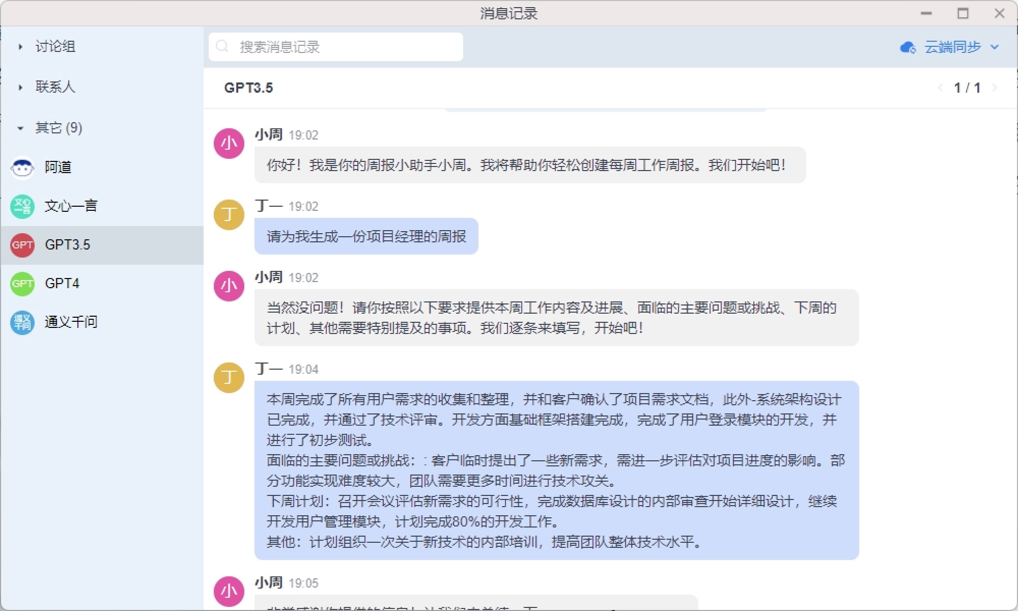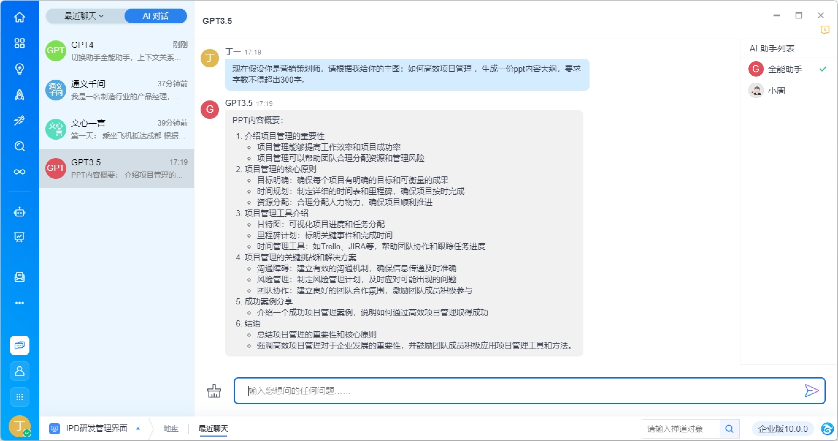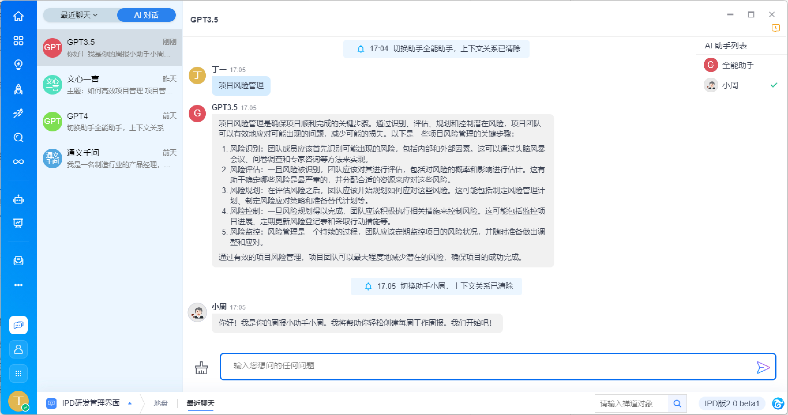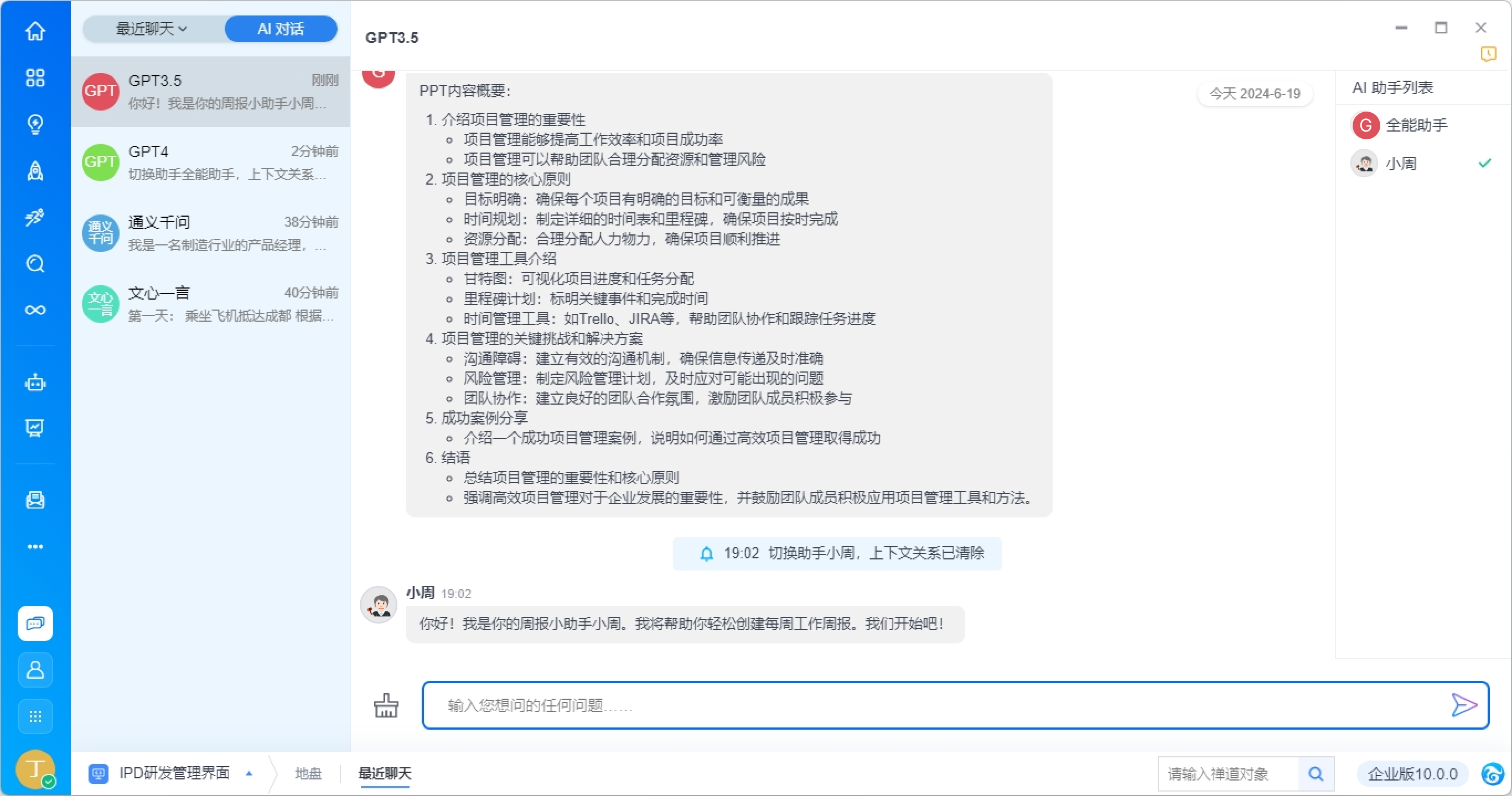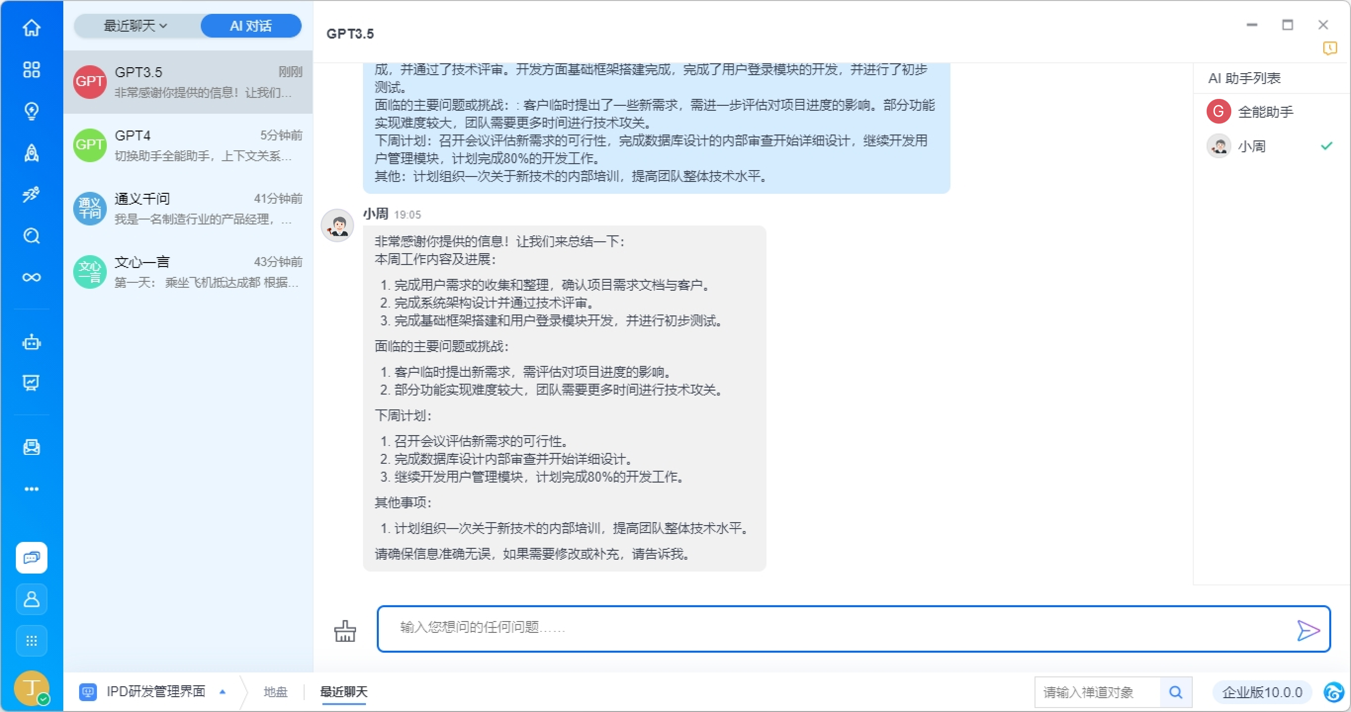 支持在右侧切换AI助手,以获得场景化内置提词返回的答复。例如切换为周报助手小周,即可根据提示要求生成一份完整的周报内容。