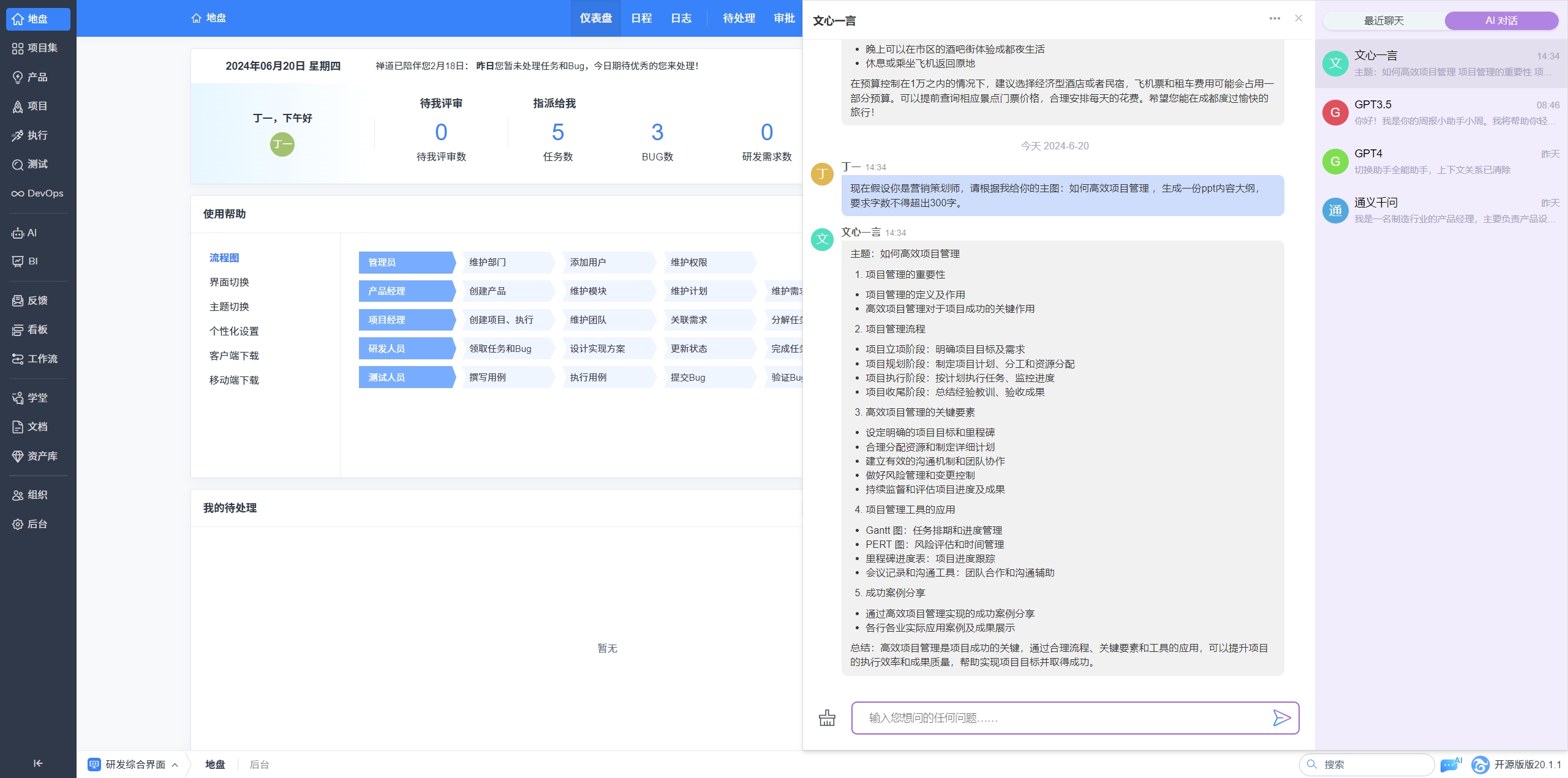 自禅道20版本客户端开始全面支持AI对话,可以与AI进行实时交谈,同时支持基于语言模型配置AI助手,赋予特定人设、语气、输出格式或欢迎语,无论是辅助编辑、进一步询问,还是其他创意类文字工作,禅道的AI对话功能都可以为您提供帮助和支持。