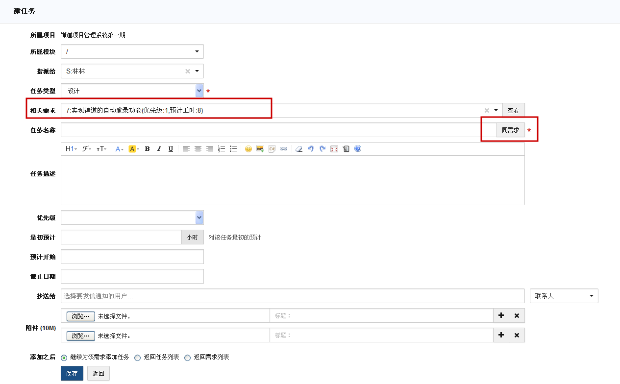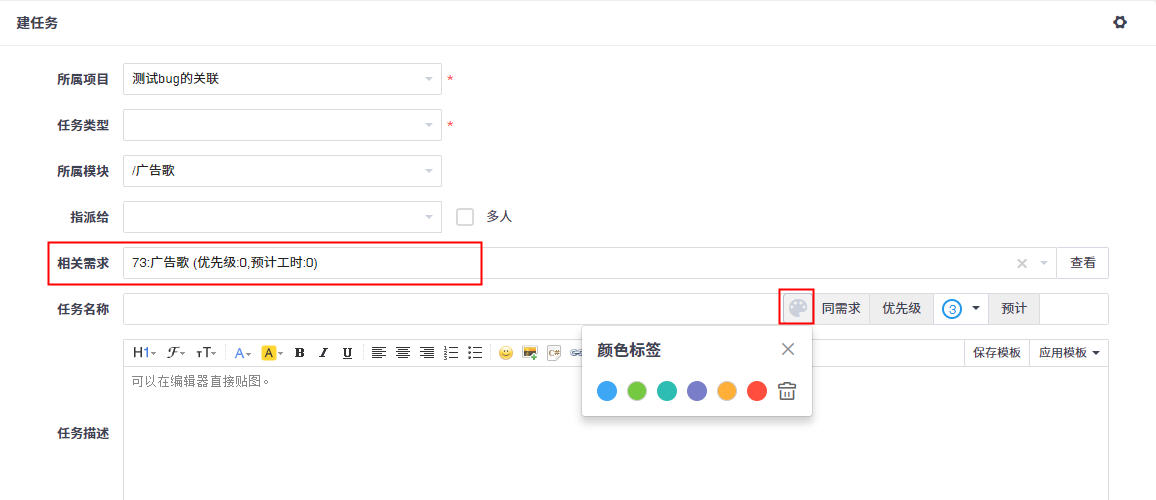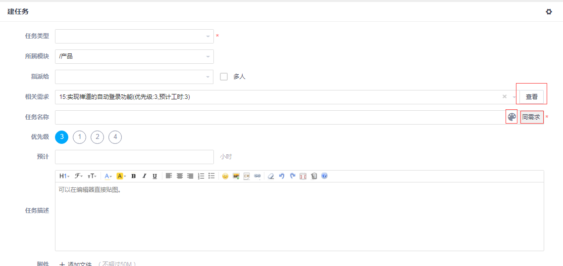 如果需求和任务的标题是一样的,可以通过”同需求“按钮快捷的复制需求的标题。