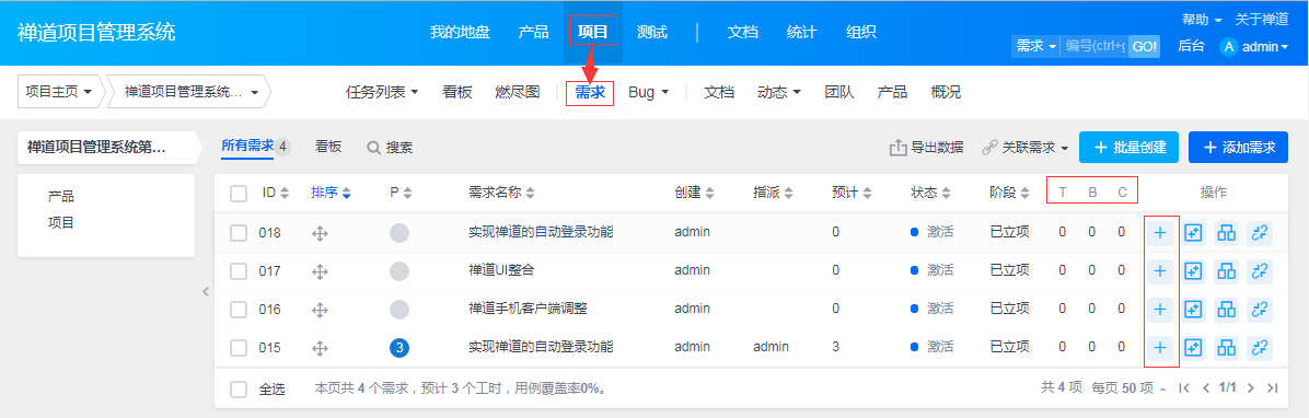 在项目的需求列表页面,可以很方便地对某一个需求进行任务分解。同时还可以查看这个需求已经分解的任务数。列表字段中的T/B/C分别代表任务数/bug数/用例数。