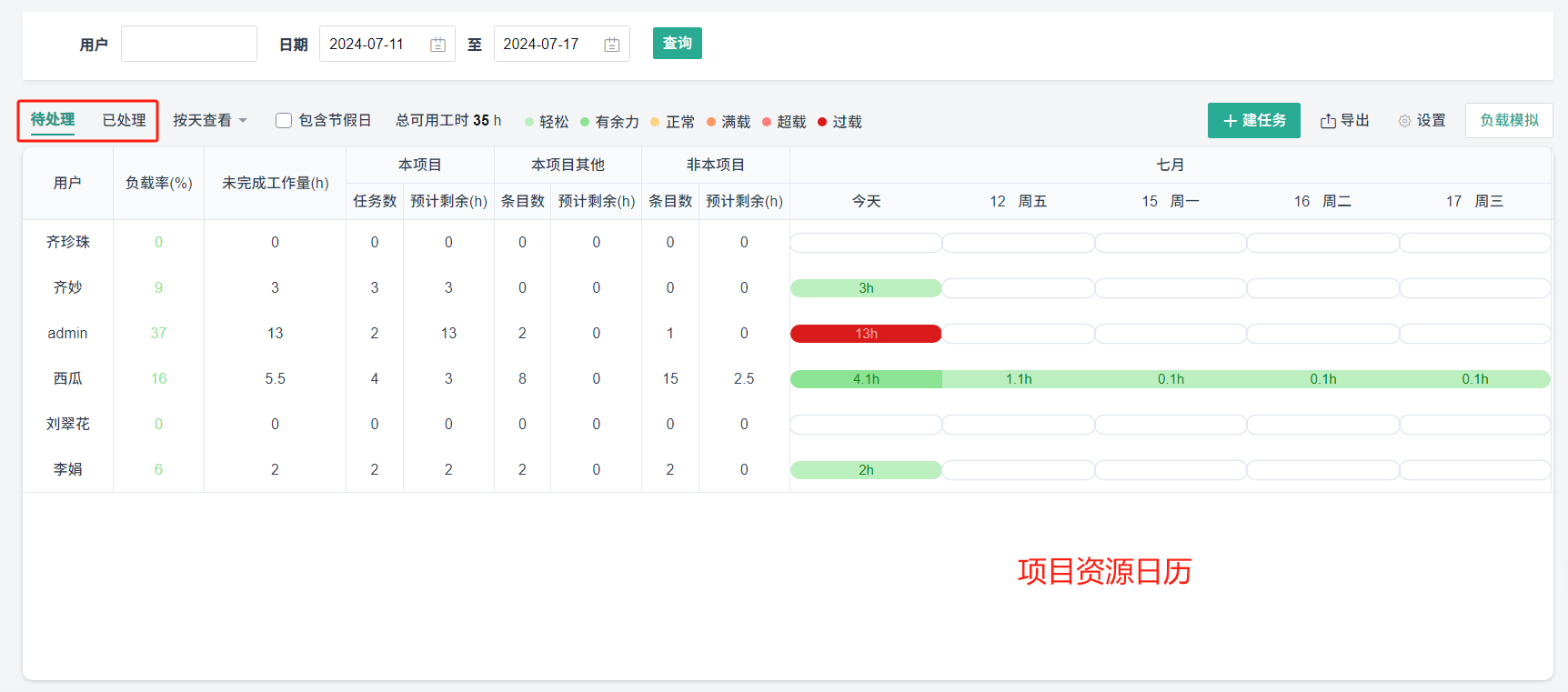 主要功能分资源日历、模拟负载两大部分功能。其中资源日历又分为资源日历页面、个人资源日历页面,这两个页面都包含待处理和已处理两种状态:
