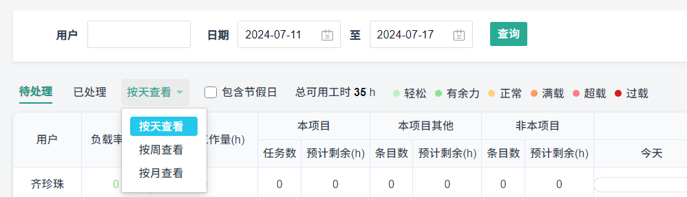 您可以在查询栏根据用户(项目下的团队成员)和日期来进行筛选查询。