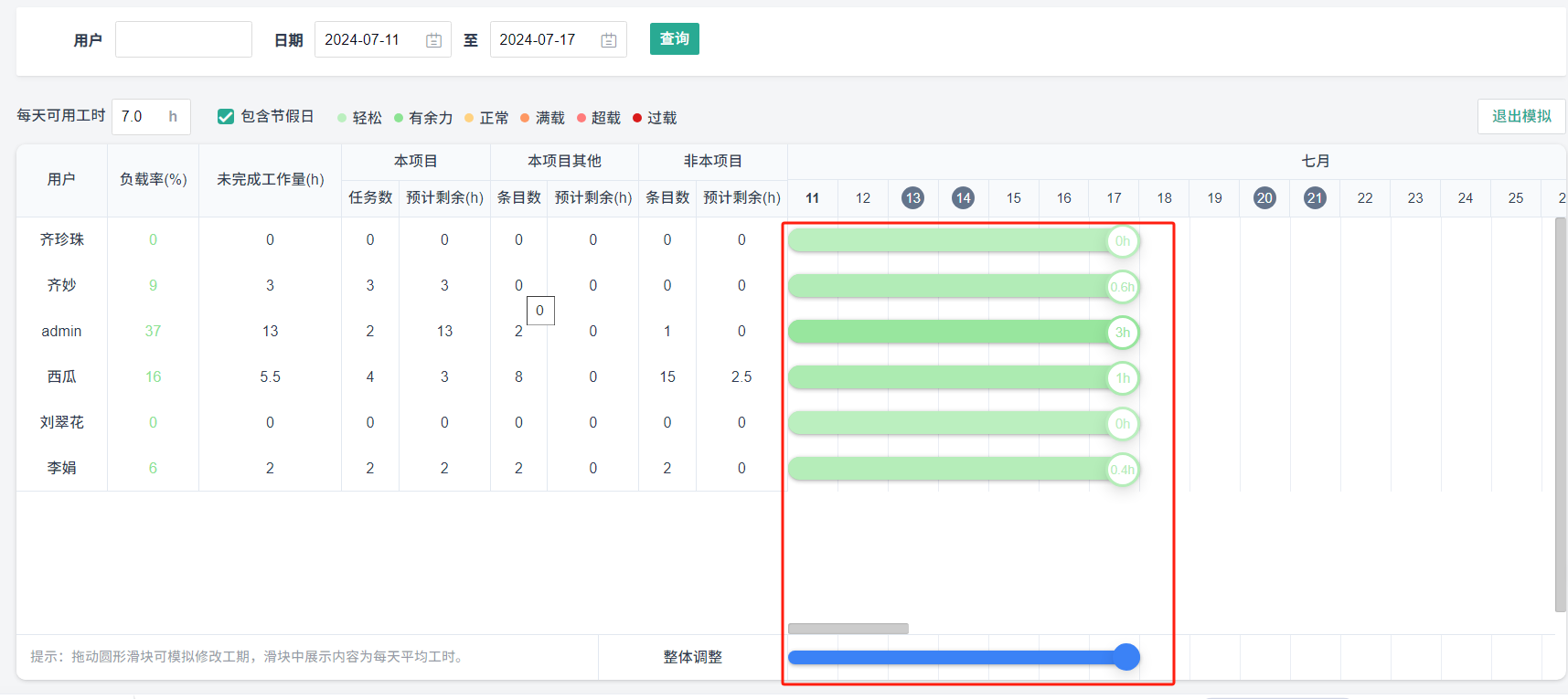 向左或向右拖动单个成员的滑块可以改变单个成员的每天平均工时和负载率;向左或向右拖动全局滑块可以查看全局的负载变化,且上方成员的滑块、负载率、每天平均工时同步变化。