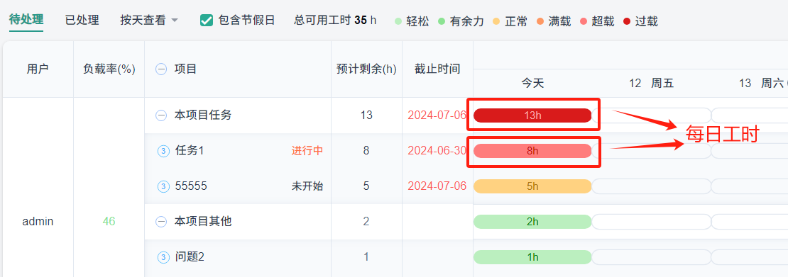 每天分摊工时=工时/工作日(若任务已超时会将该任务的工时算到当前工作日中)