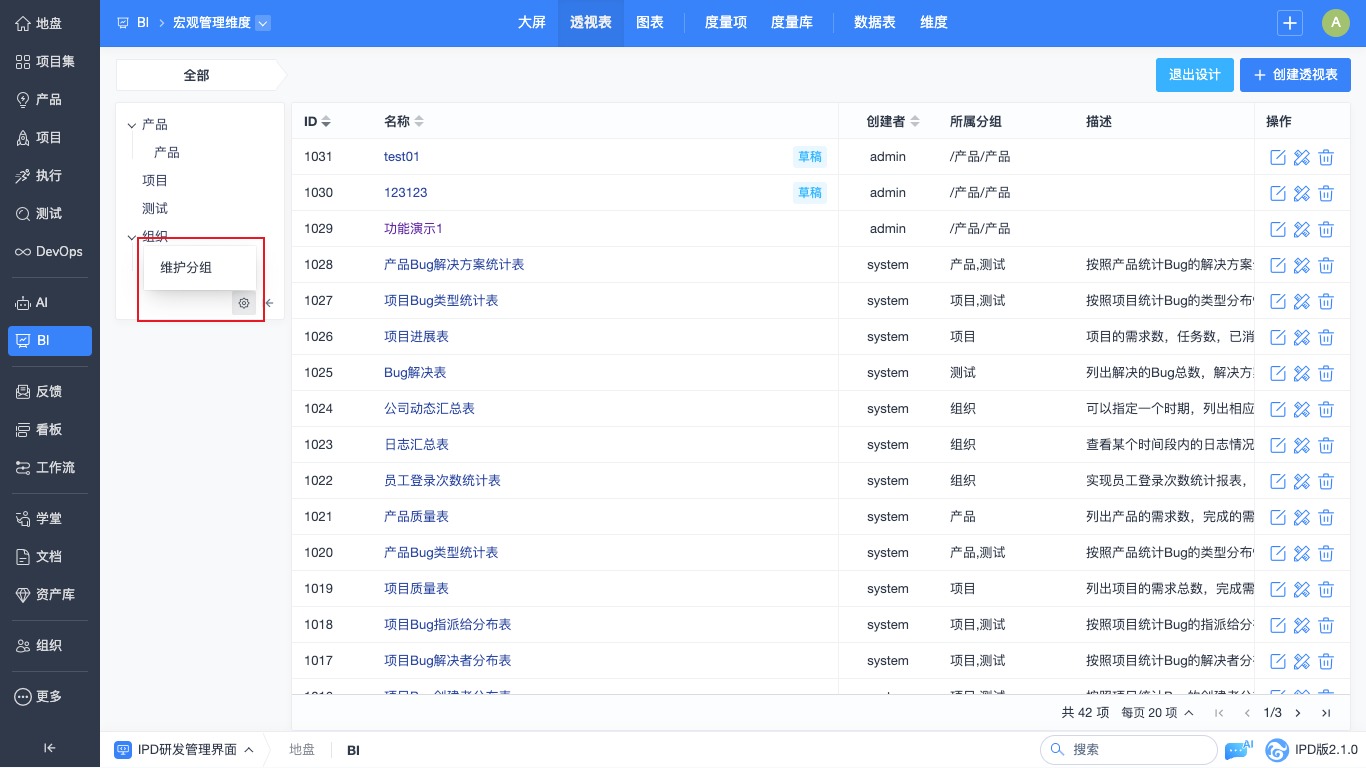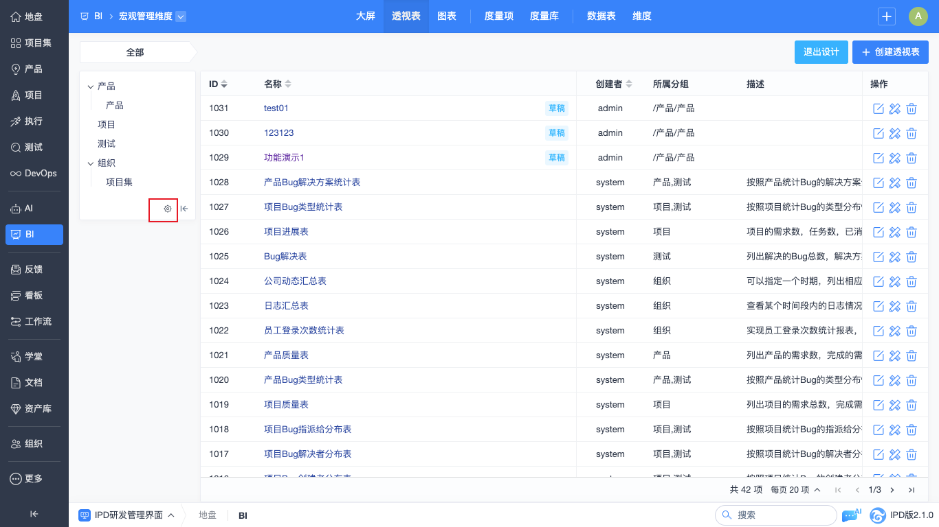 在“BI”-“透视表”的设计管理页面中,可以对透视表进行设计、编辑、删除的操作。
