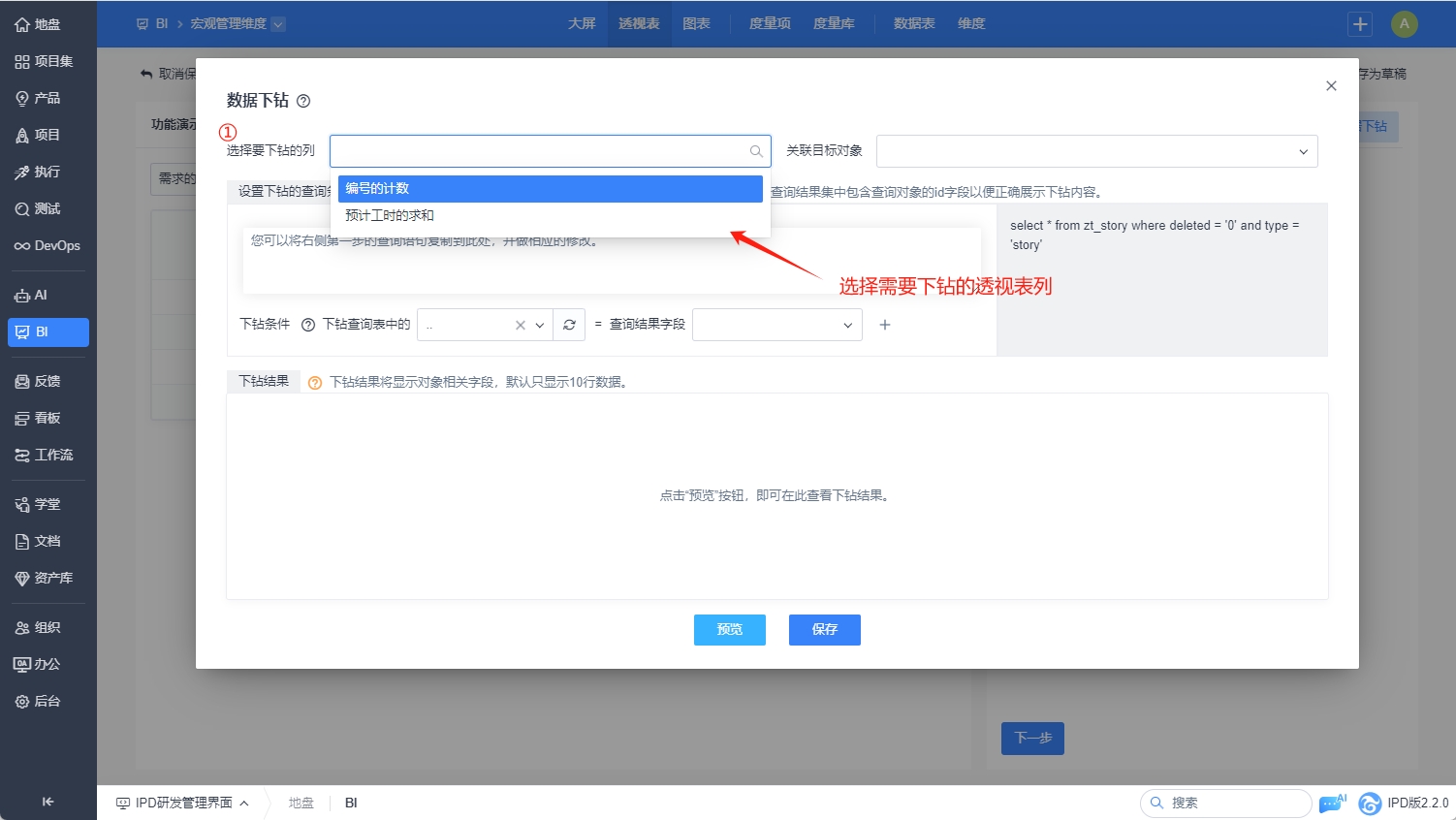 下钻弹窗中选择要下钻的列。