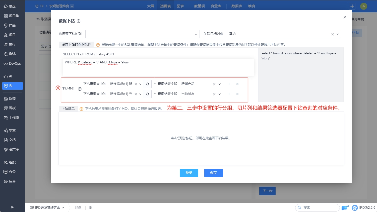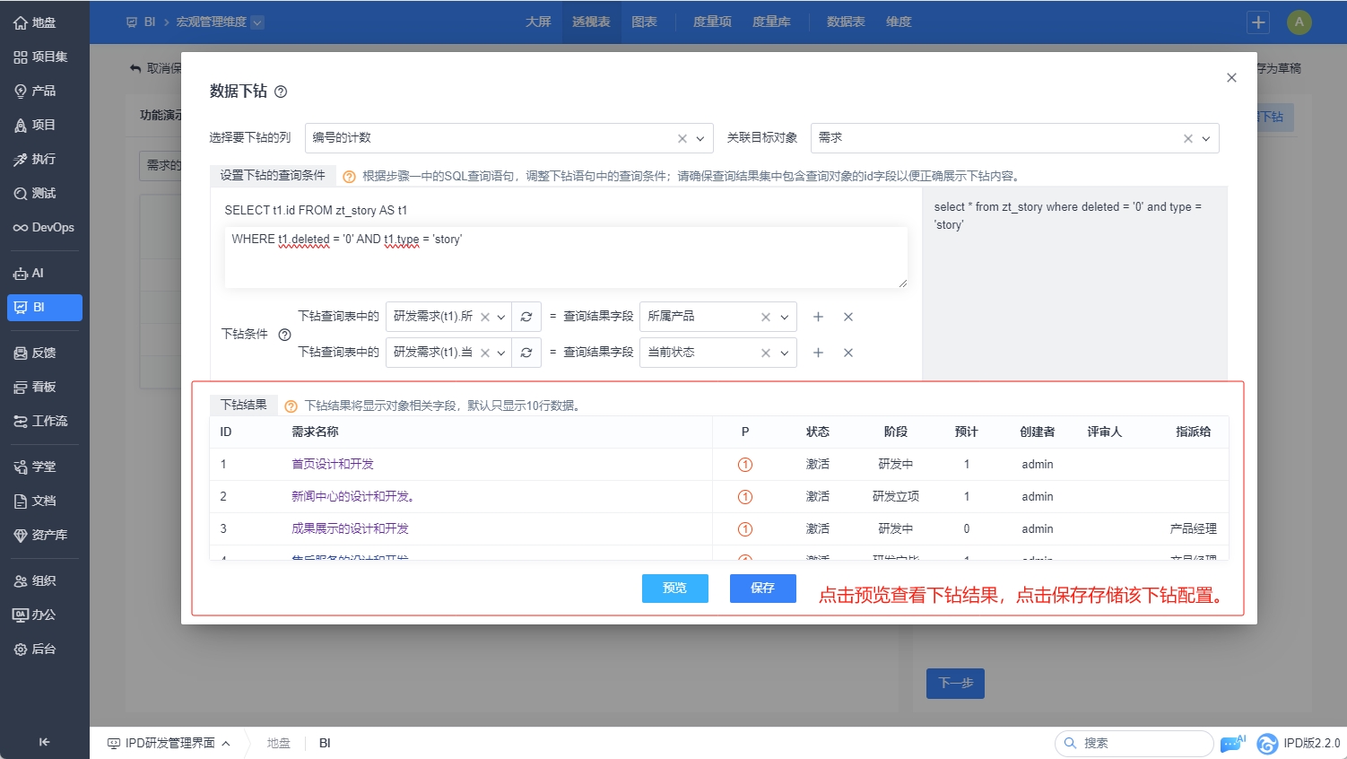预览和保存下钻配置。