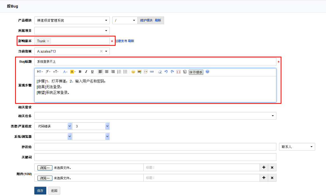 - 在创建bug的时候,必填的字段是影响版本,bug标题,重现步骤这些基本的信息。