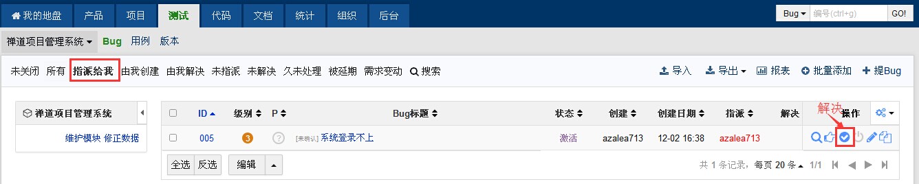 当一个bug指派给某一位研发人员之后,他可以来确认解决这个bug。在对bug进行处理之前,需要先要找到需要自己处理的bug。禅道提供了各种各样的检索方式,比如指派给我,可以列出所有需要我处理的bug。
