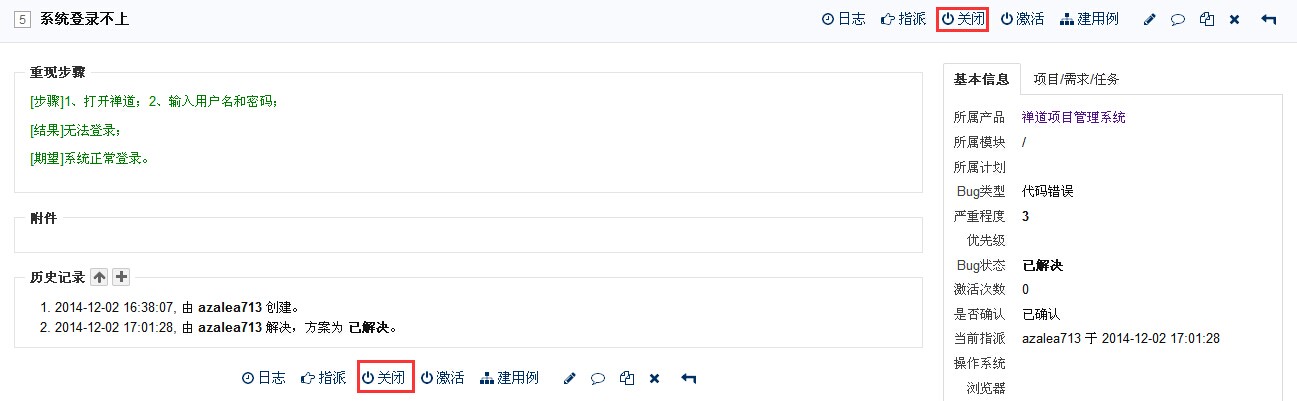 关闭bug:当研发人员解决了bug之后,bug会重新指派到bug的创建者头上。这时候测试人员可以来验证这个bug是否已经修复。如果验证通过,则可以关闭该bug。(bug列表页和详情页中都有“关闭”按钮。)