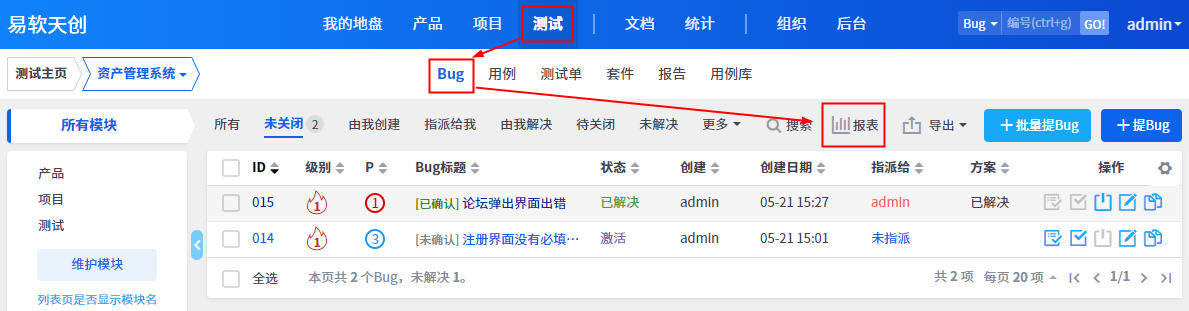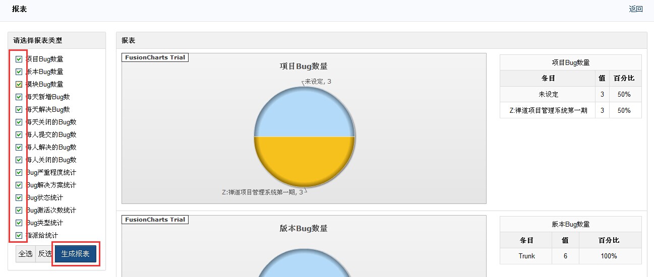 在bug列表页面,点击页面上部的统计报表,即可出现统计报表页面。