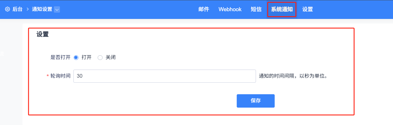 4.系统消息通知在后台统一设置开关和轮询时间。