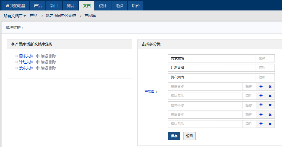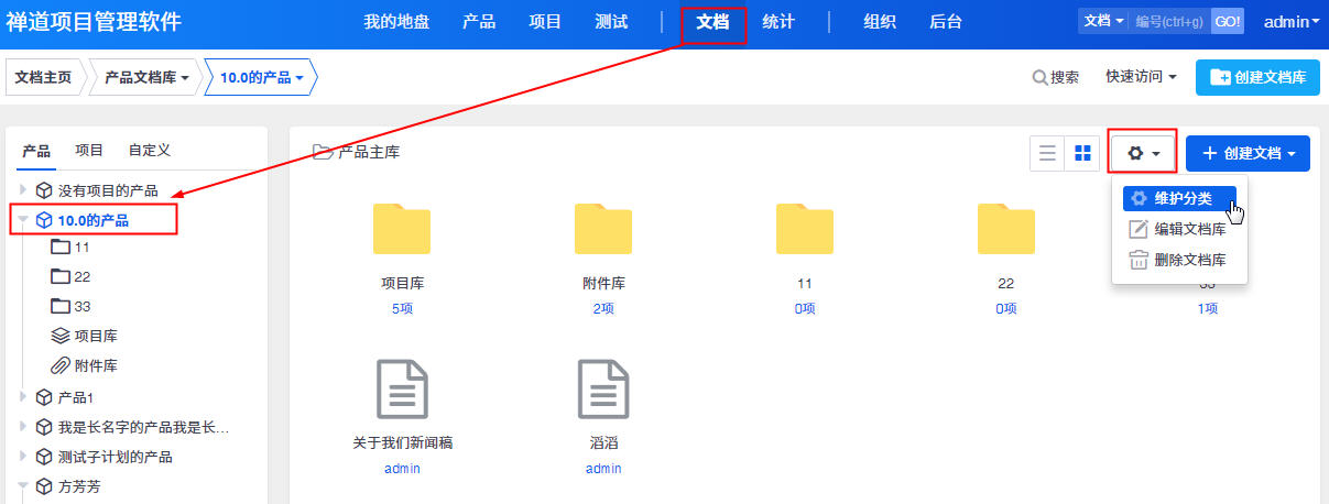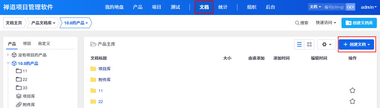 禅道文档库共分为三种类型:产品文档库、项目文档库和自定义文档库。