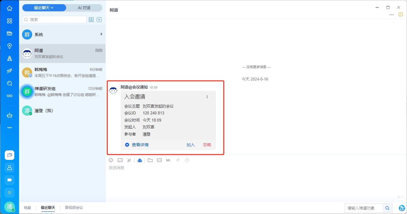 2. 被邀请的用户将会受到阿道的会议邀请通知。
