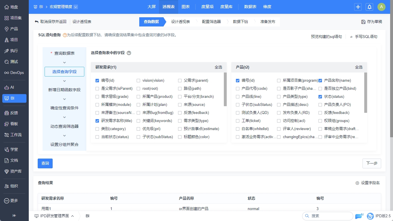- 选择完要查询的数据表后,需要从已选的数据表中选择需要查询的字段。