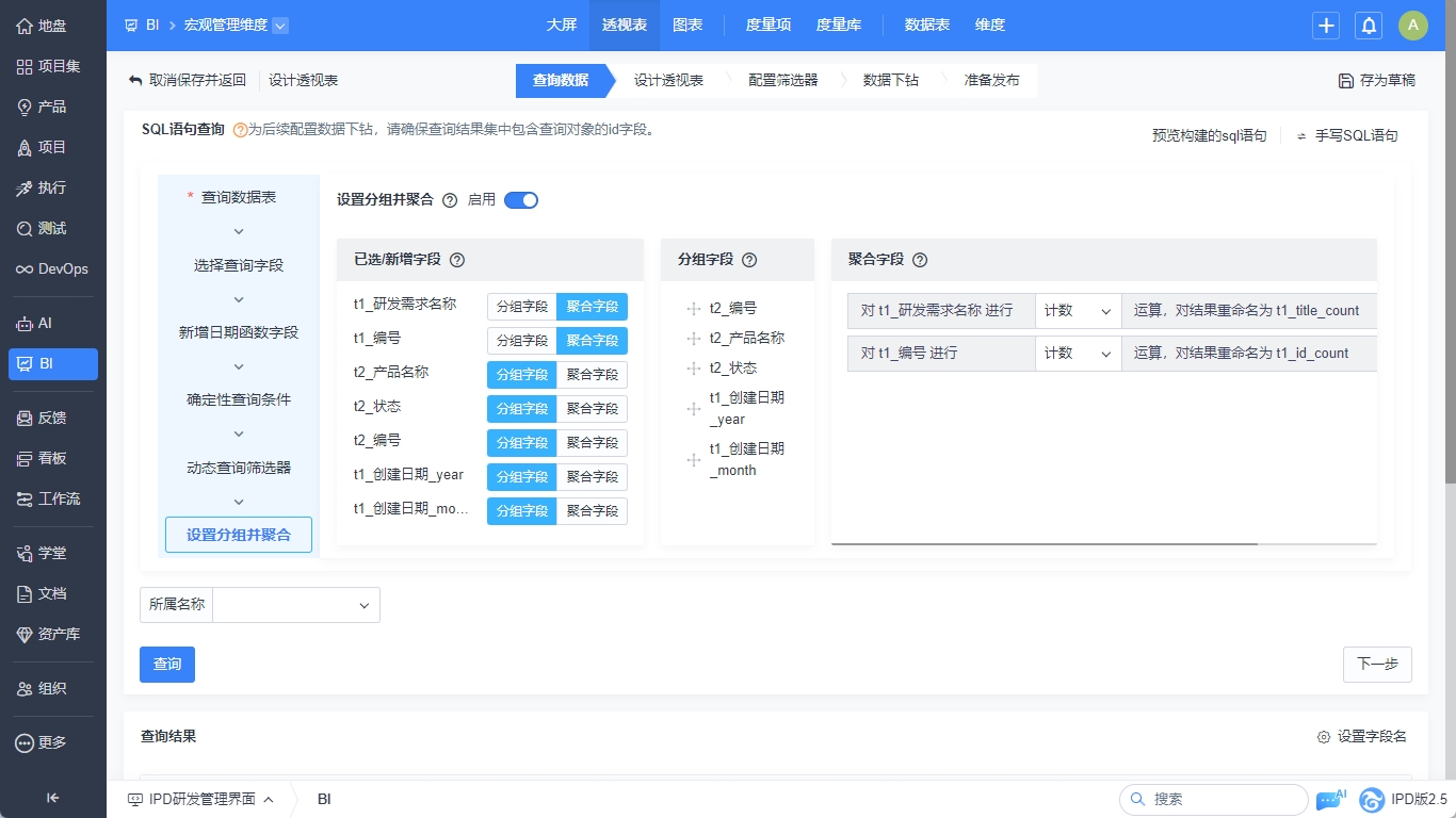 - 分组字段与聚合字段会展示在相应的区域中。