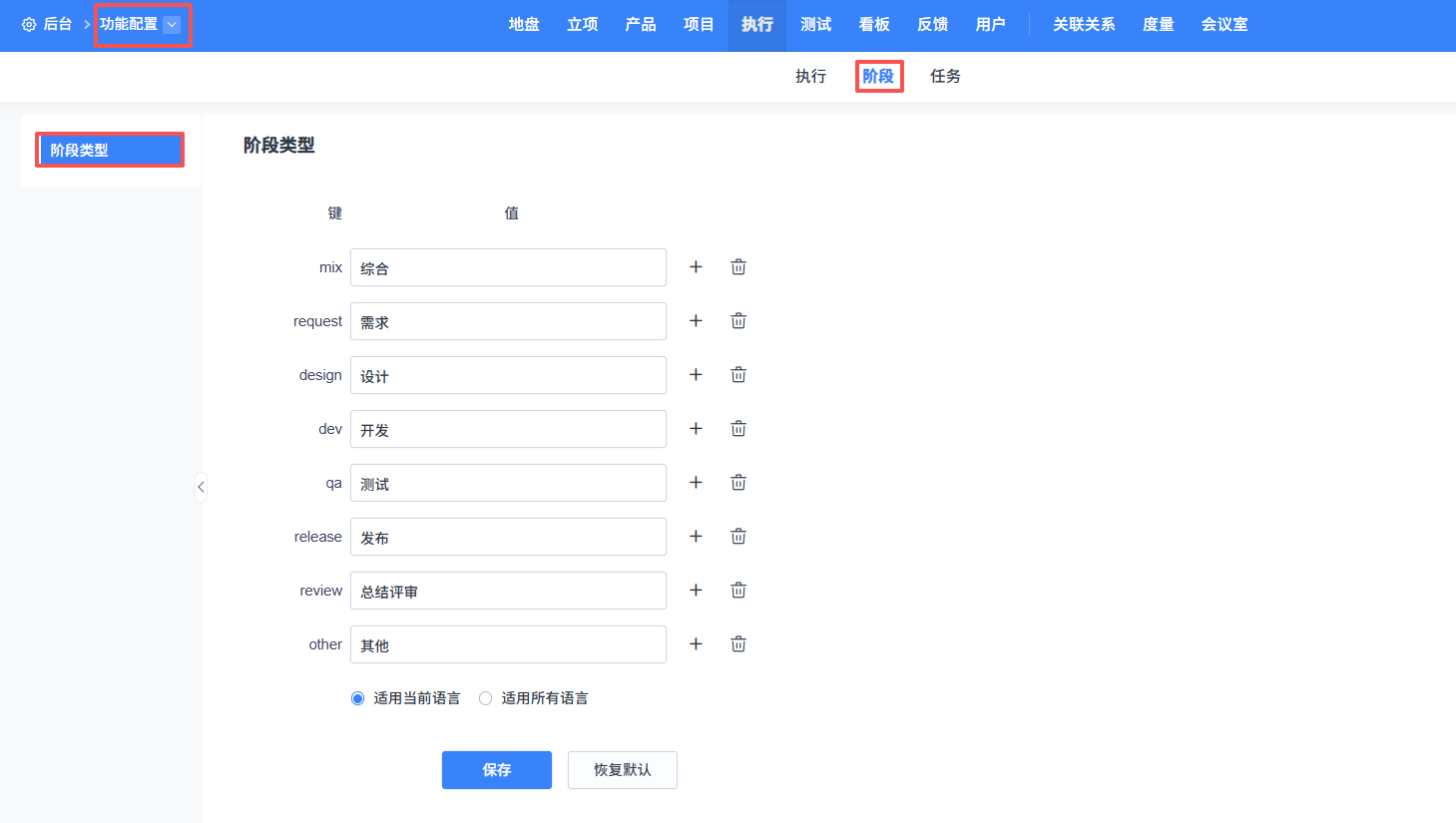我们默认的阶段类型有综合、需求、设计、开发、测试、发布、总结评审和其他。你可以到后台--功能配置--执行--阶段里根据实际工作需要对阶段类型进行自定义。你可以修改原来的阶段类型,也可以删除掉原来的阶段类型,添加自己实际需要用的阶段类型。