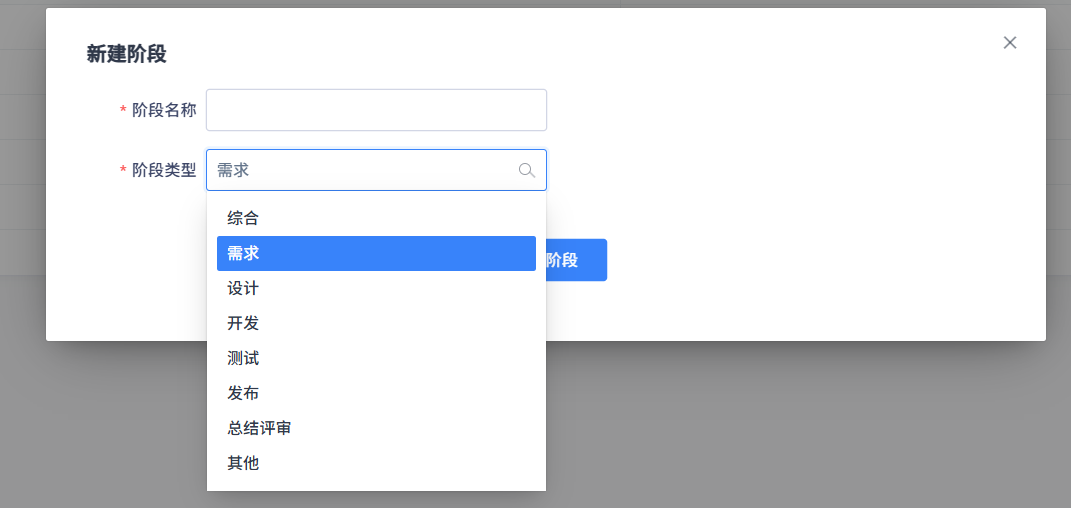 我们默认的阶段类型有:需求、设计、开发、测试、发布、总结评审。