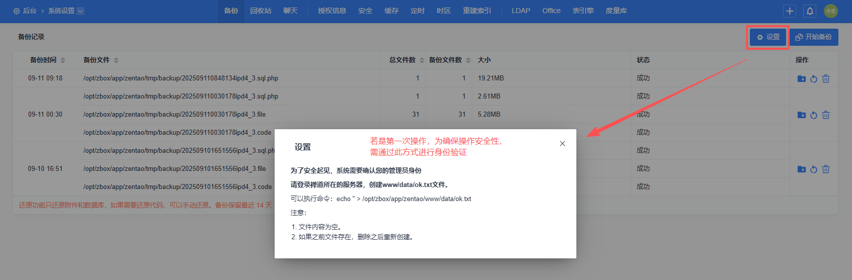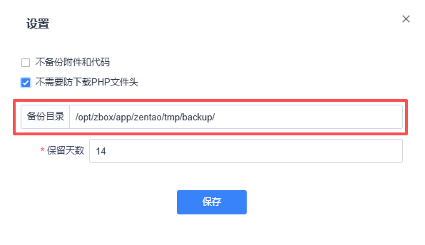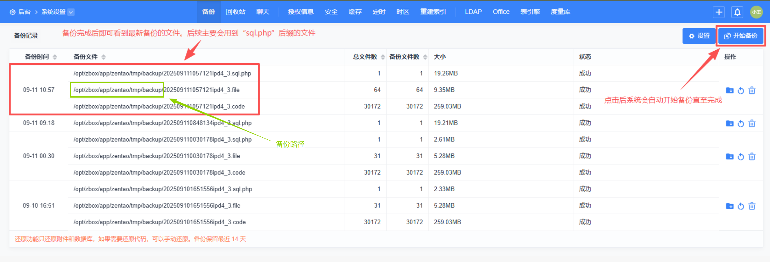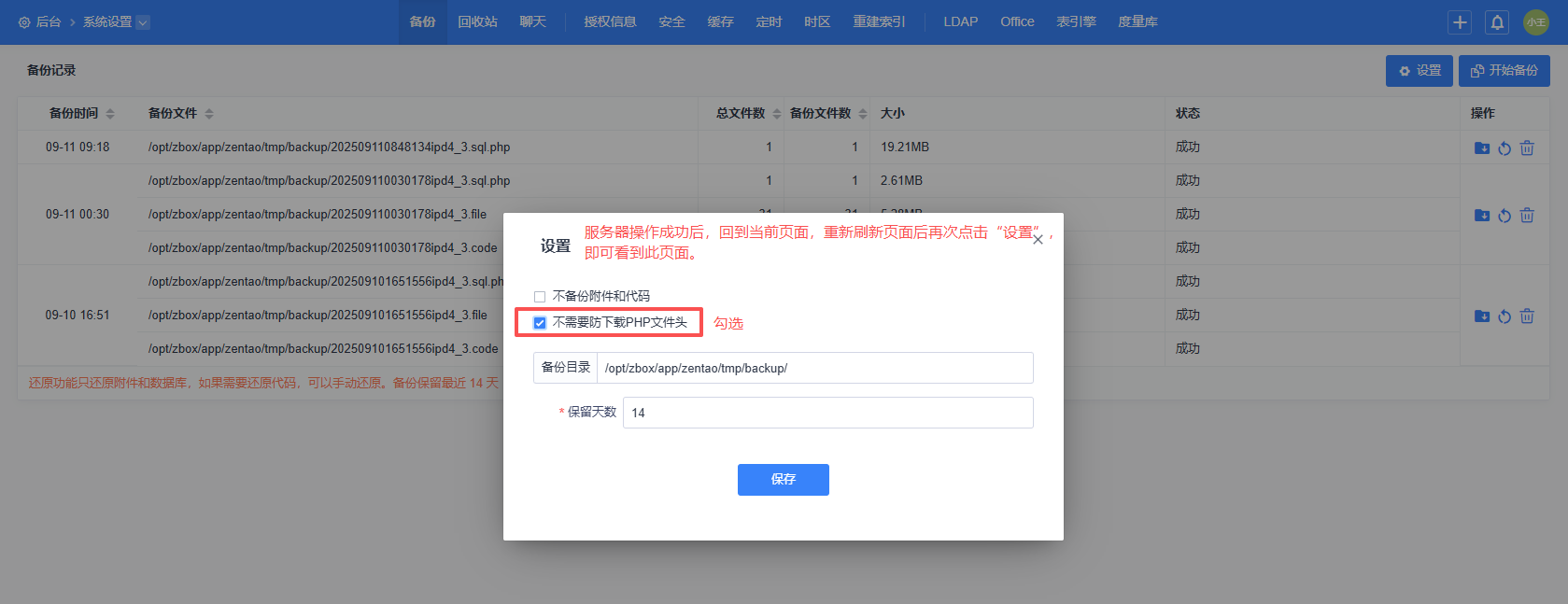 4、备份完成后,页面会显示最新的备份文件(后续主要会用到“sql.php”后缀的文件)。备份文件同时也展示备份路径。如图所示,下方示例禅道系统(服务器为Linux系统)的备份路径为“/opt/zbox/app/zentao/tmp/backup”(此路径可从当前页面右上角的“设置”中进行更改,所以实际备份可能与当前示例路径不同。Windows服务器的路径也会与下方示例不同。请参考实际备份文件当中展示的路径)。