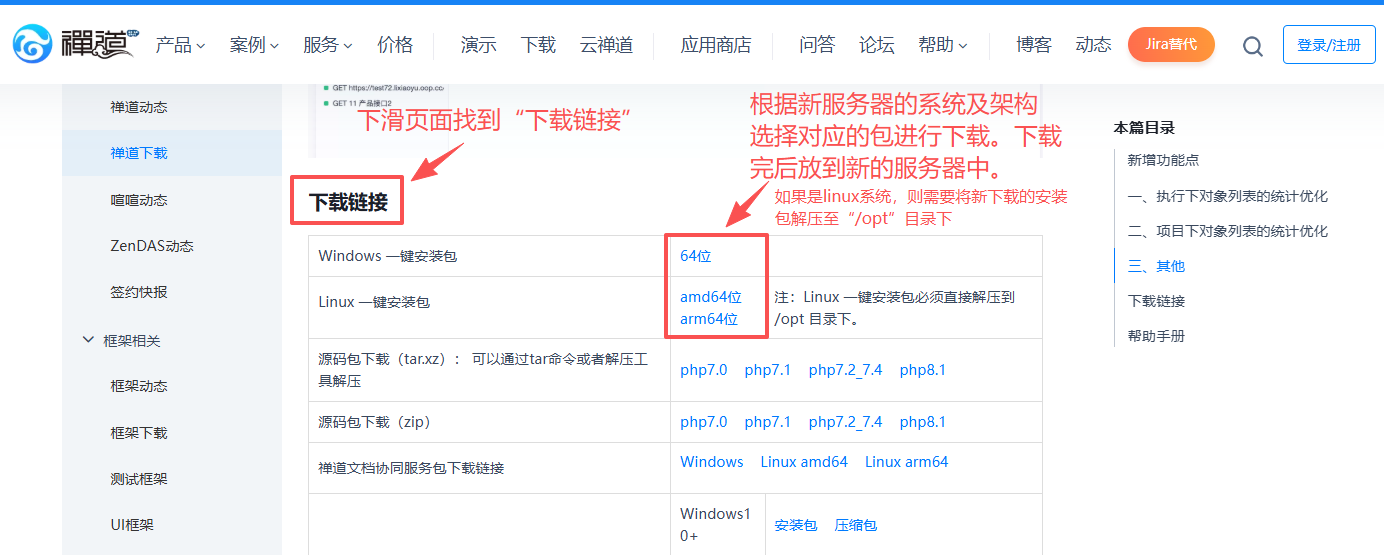 2、点击进入要下载禅道的页面,下滑页面找到“下载链接”(通常在页面最下方),根据新的服务器系统及架构选择对应的禅道进行下载;
