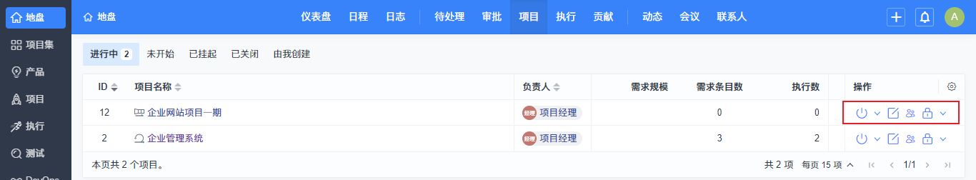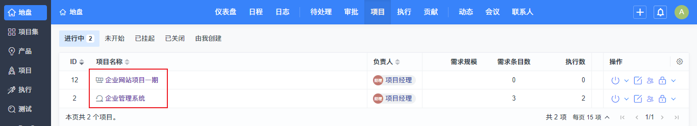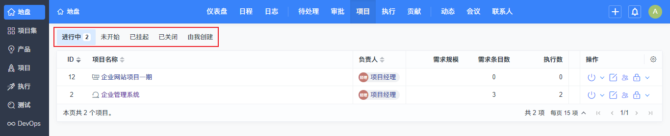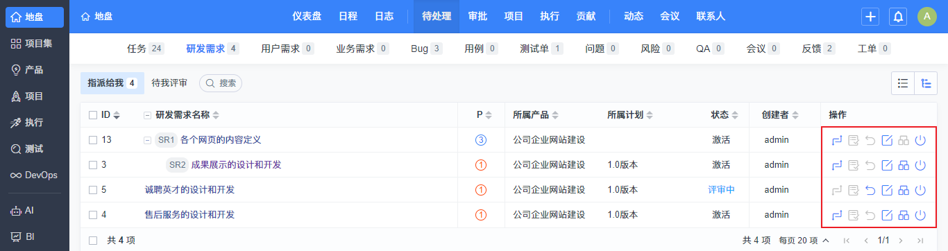 地盘-待处理展示需要您处理的一些待办项,包括指派给您的任务、研需、用需、业需、Bug、用例、测试单,待您审批的研需、用需、业需等。收费版本中还包括指派给您的反馈、工单、问题、风险、QA、会议。通过待处理项的列表,您可以快速查看并处理这些待办项。
