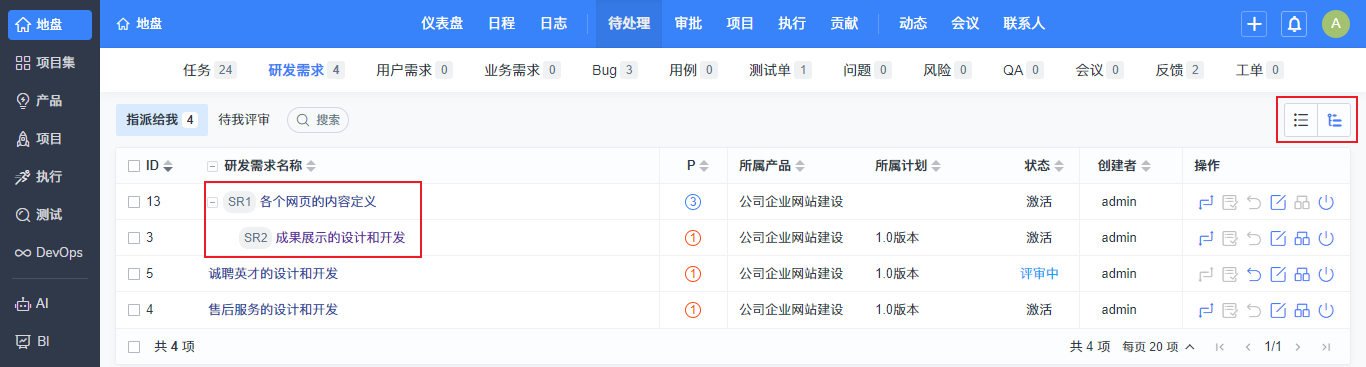 需求列表支持平铺和树状两种展示方式,平铺适合单个追踪需求,树形结构适合查看需求的层级关系,结构化跟踪需求进度。
