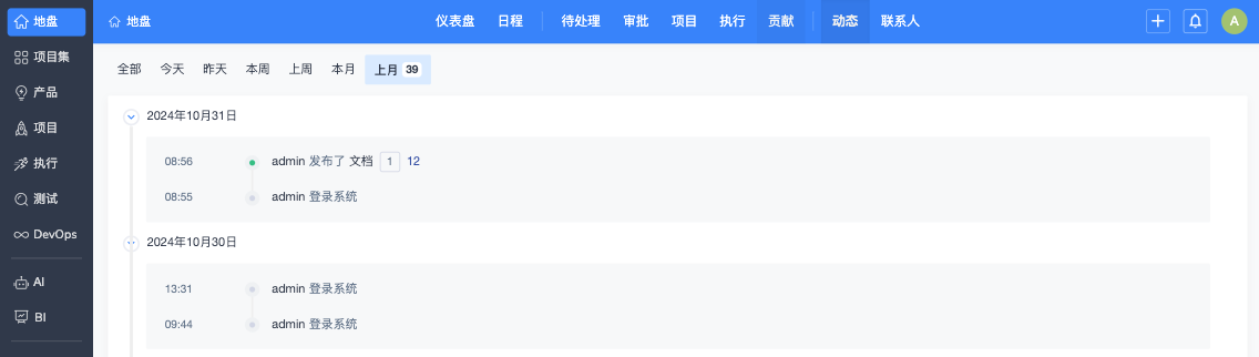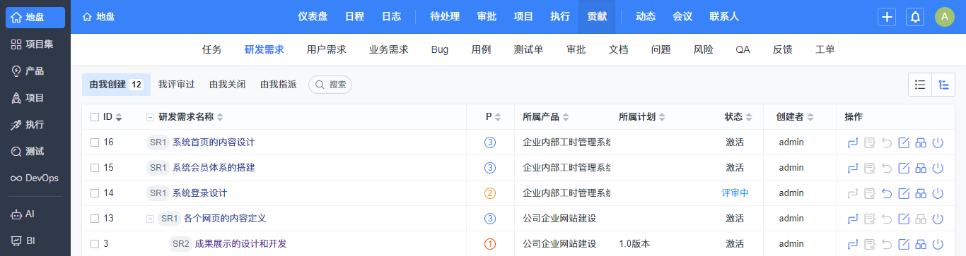 地盘-贡献则展示您已经处理的一些事务,包括由我创建的、我评审过的、由我关闭、由我指派、由我完成、由我取消的一些事务项,通过贡献列表,您可以快速查看您在公司的工作和贡献。