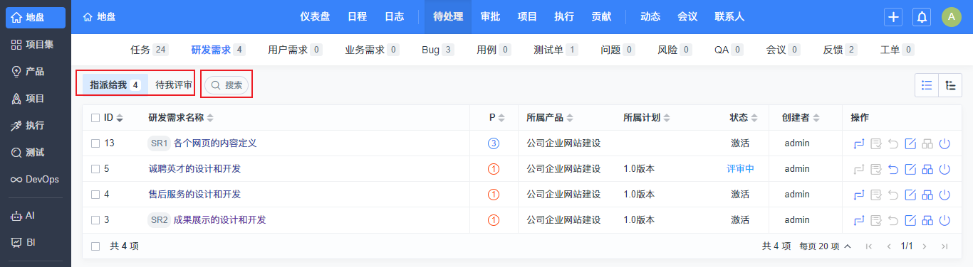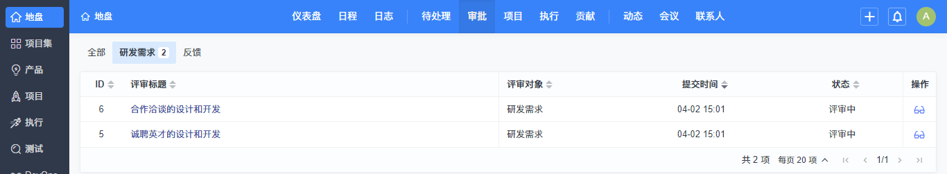 地盘-审批展示需要您审批的事务,包括任务、研需、用需、业需、Bug、用例等,收费版还包括待您评审的反馈、项目中基线的评审,通过审批流配置的待评审项也会在这边展示。