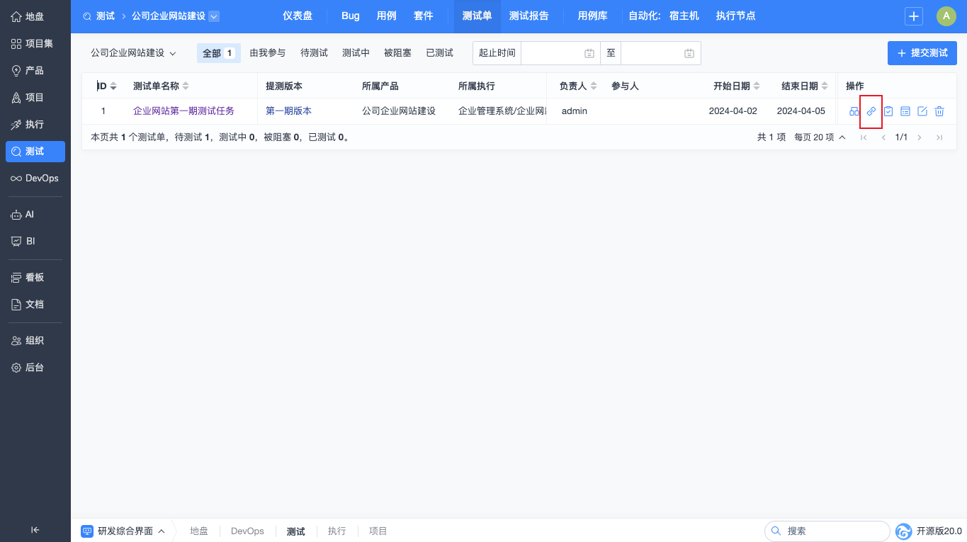 在新建的测试单中,可以通过 “关联测试用例” 功能,从用例列表筛选用例关联到测试单中。