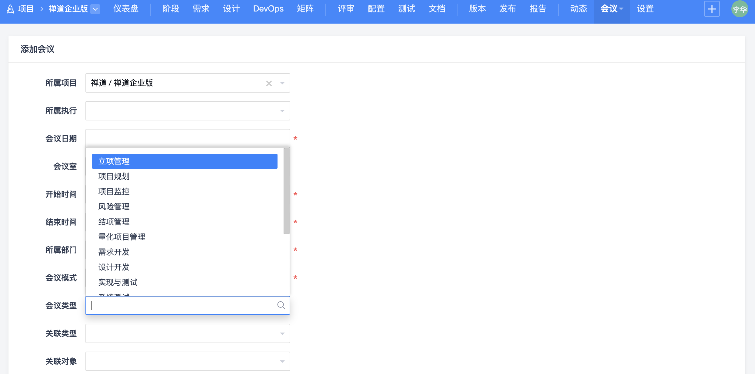 点击“项目”--“其他”--“会议”,添加会议。“会议类型”及“关联类型”已经内置选项。