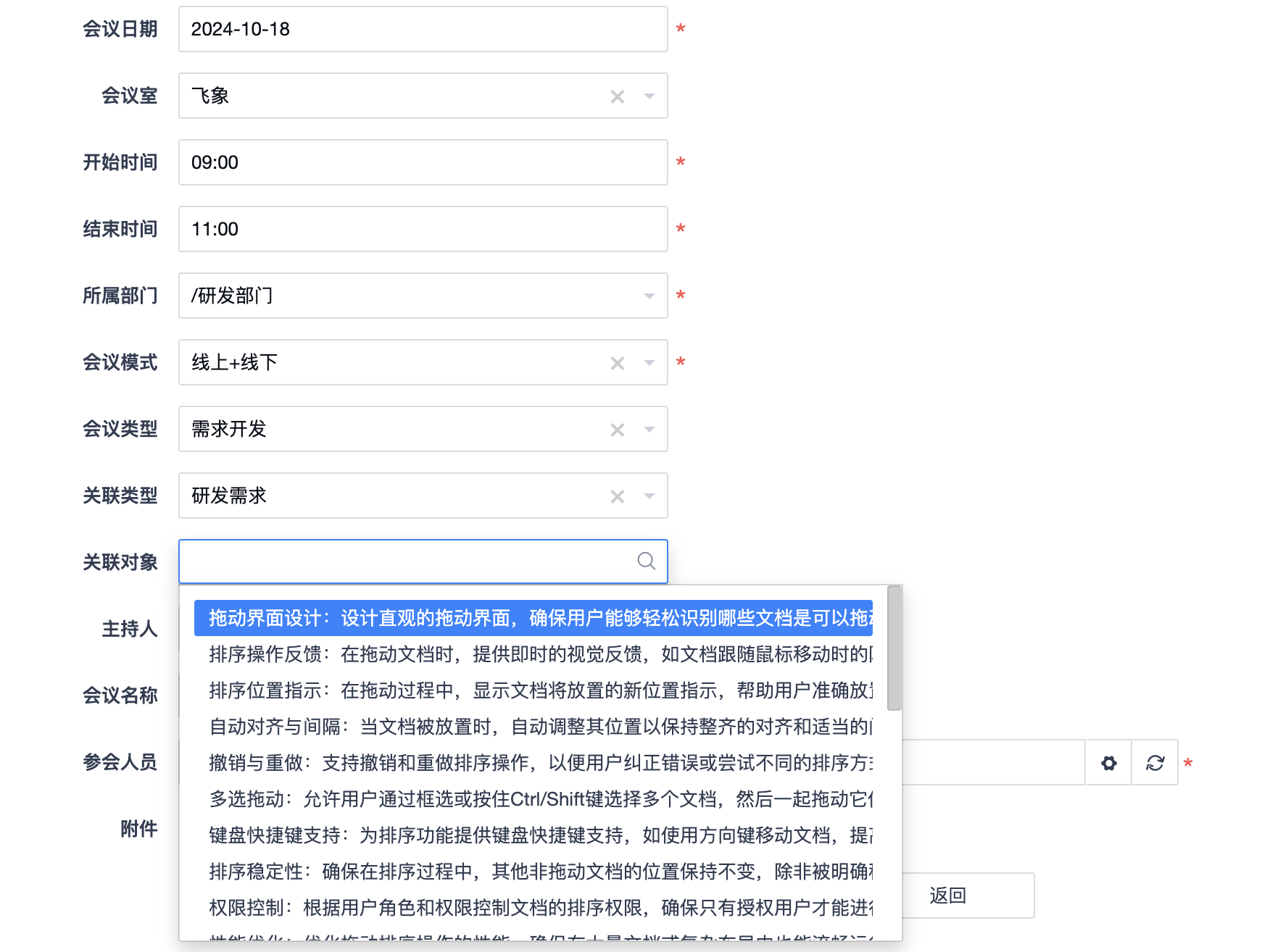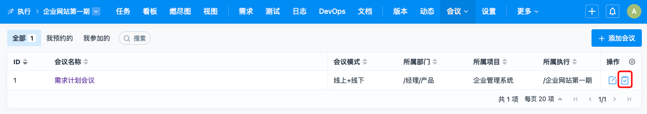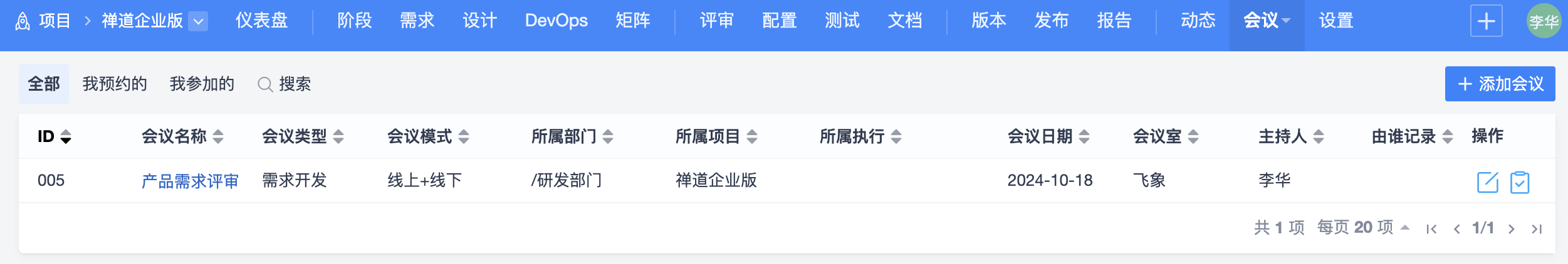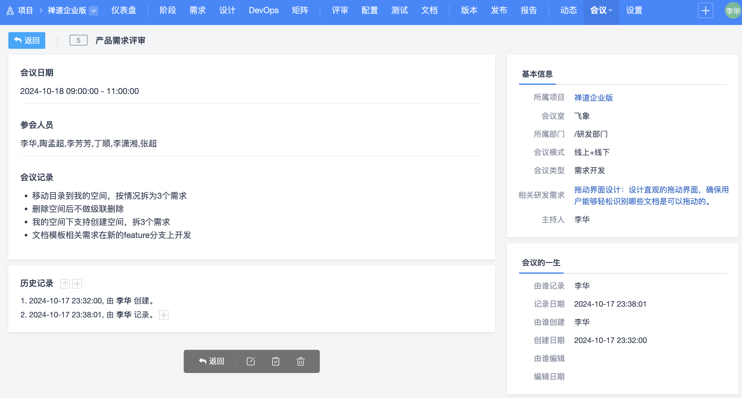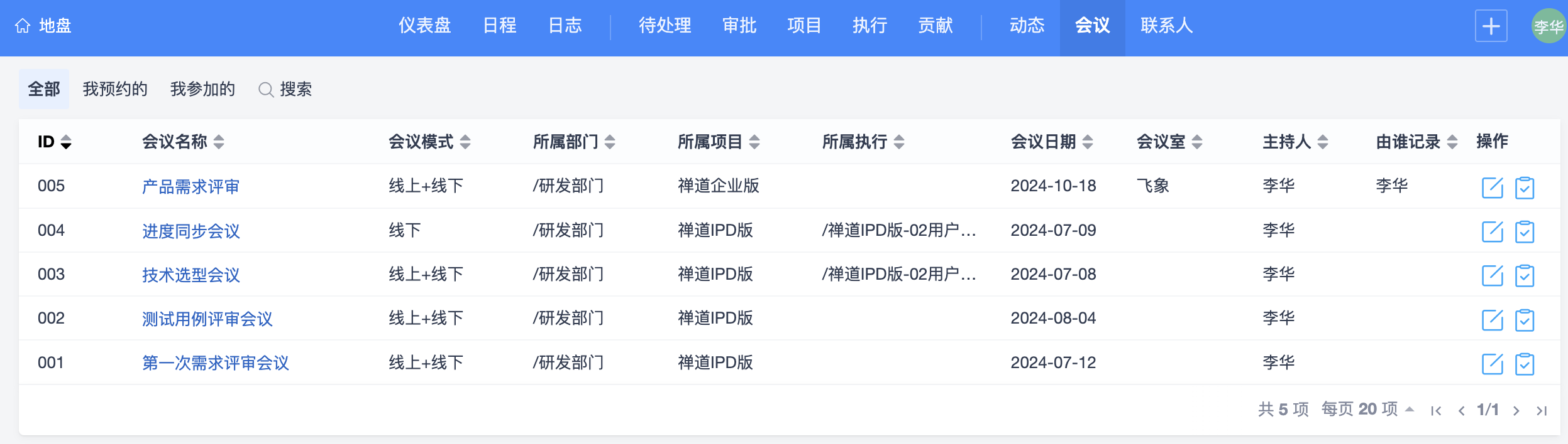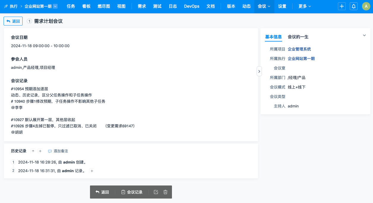 通过会议管理功能,我们可以将公司中所有的会议室管理起来,然后在项目中可以选择具体的会议室,发起会议邀请,并且在会议后记录会议纪要,帮助项目管理者记录和追溯重要事项。