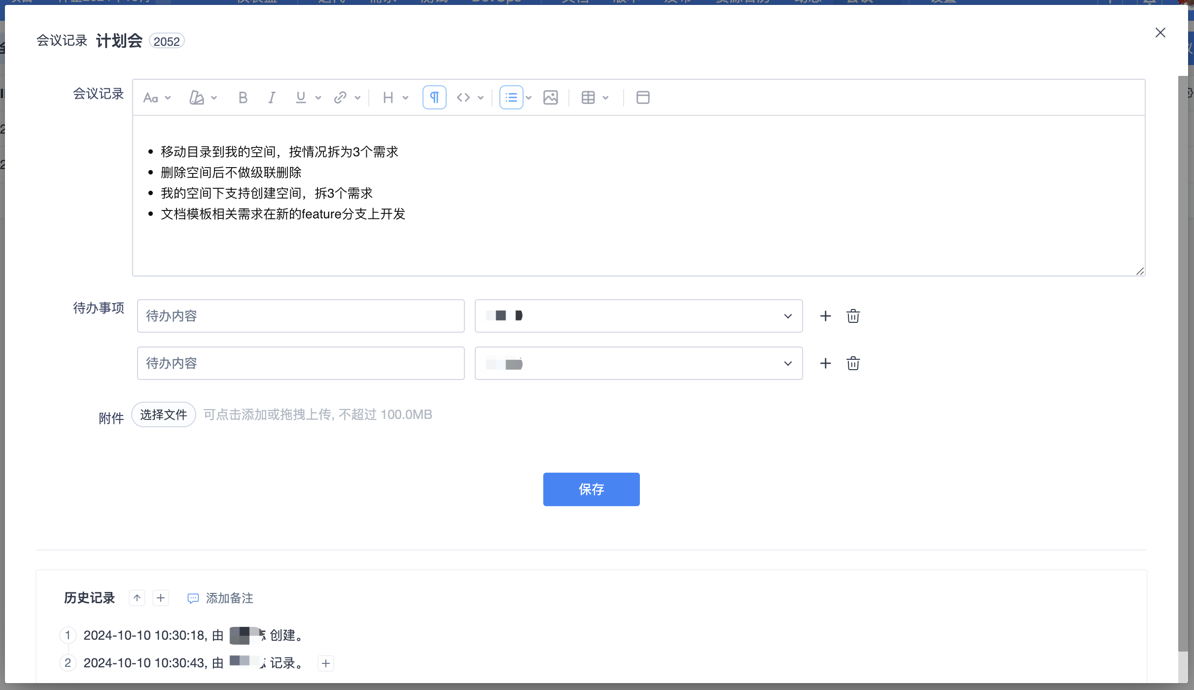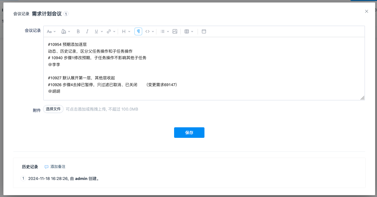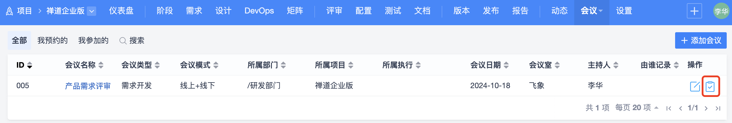 点击列表操作部分的“会议记录”按钮,可以添加会议记录。