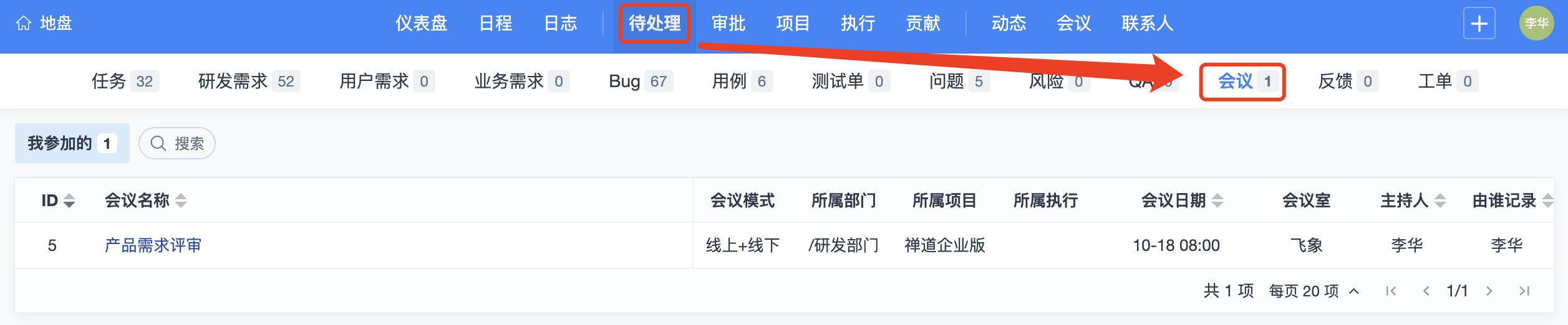 在“地盘”--“待处理”--“会议”下,可以查看到自己将要参加的会议列表。