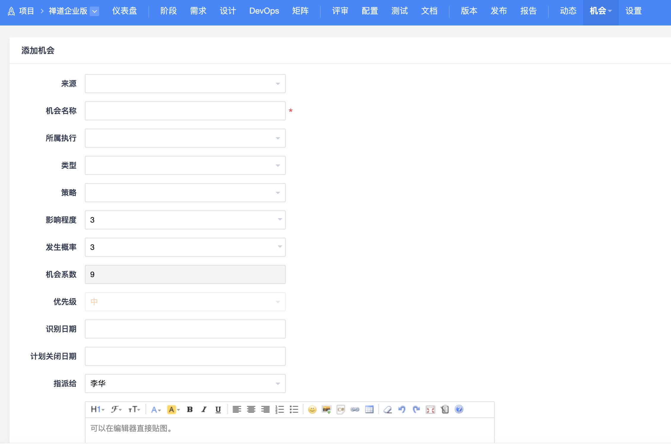 点击机会列表页面右上角的添加按钮,可以进入机会的添加页面。