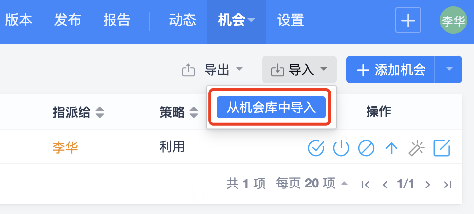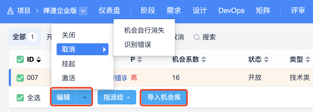 项目中的机会可以导入资产库--机会库中进行管理,以便于在其他项目中作为参考进行识别、复用。