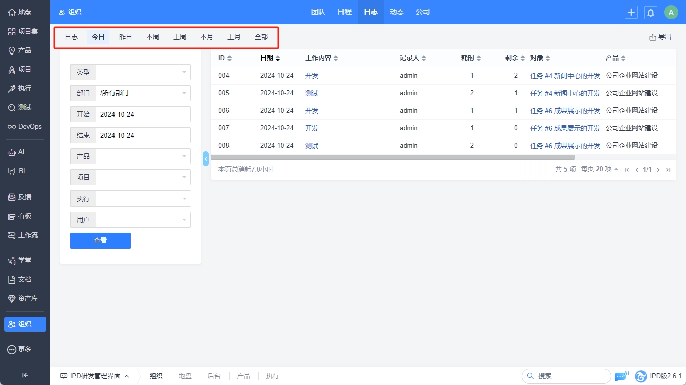 在日志表中查看不同部门成员不同时间周期内的日志记录。