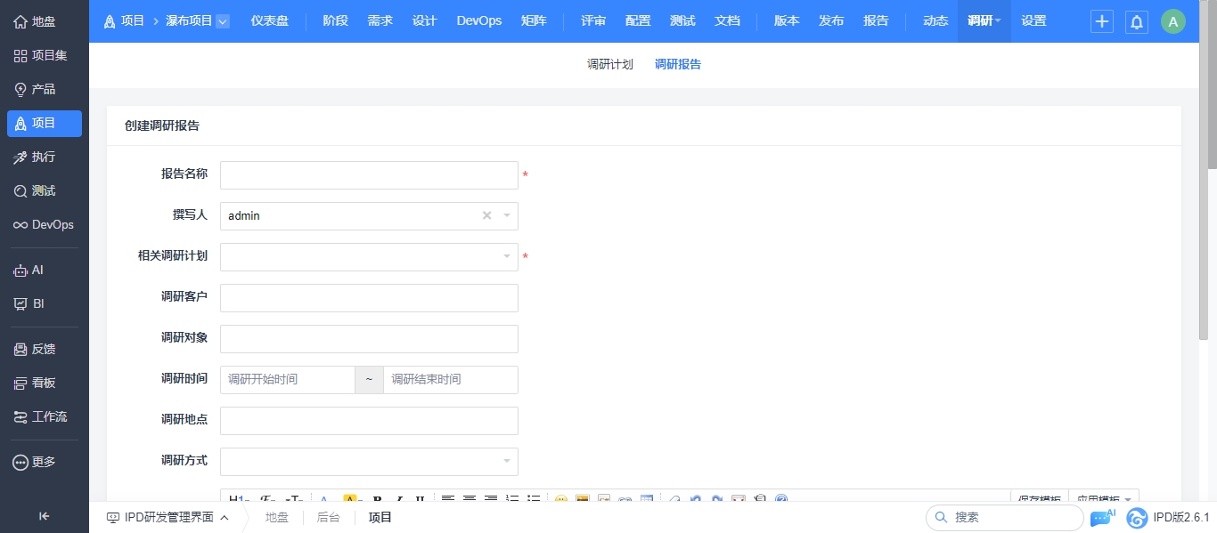 点击列表操作栏中的生成生成调研报告按钮,可以进入调研报告创建表单。