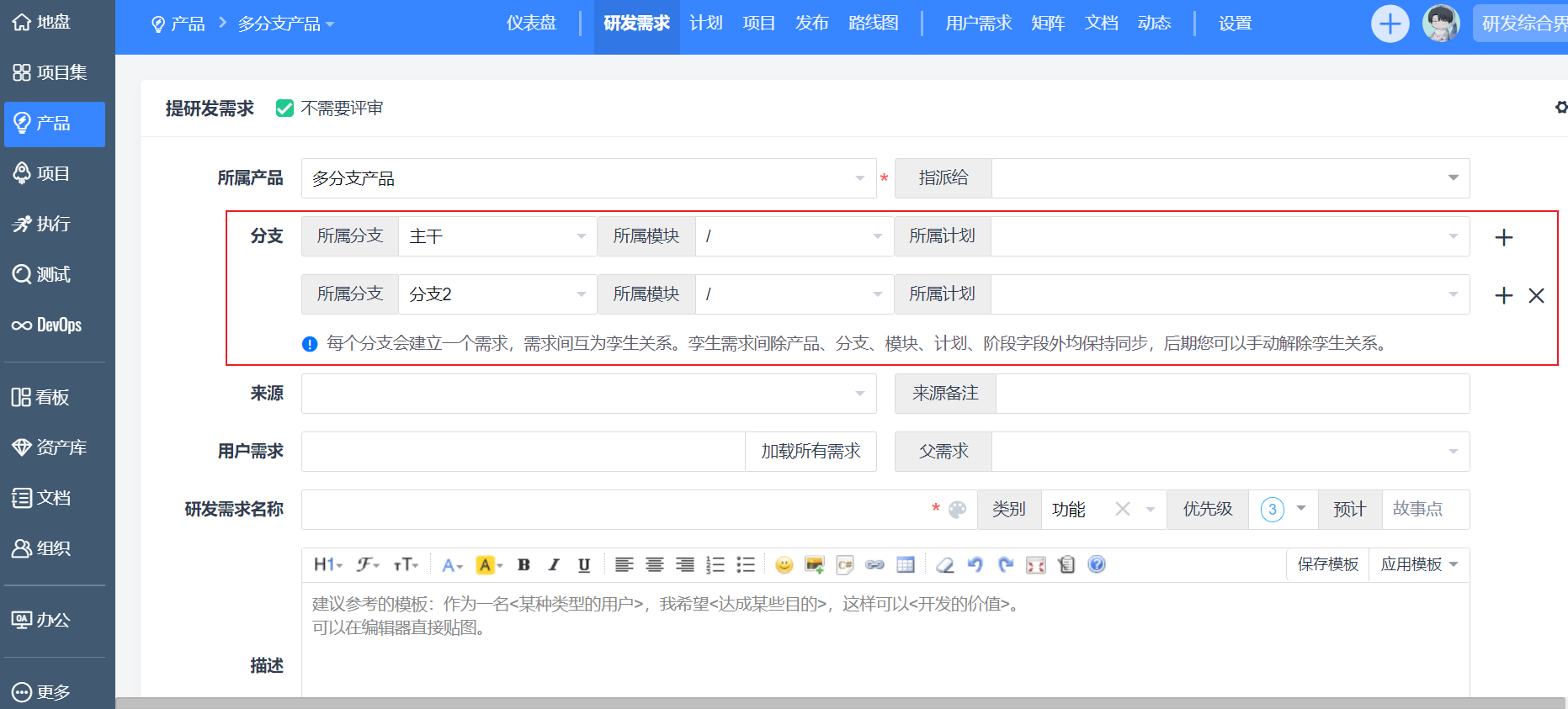 为满足管理多分支/多平台产品的各种场景,禅道支持创建计划、版本、发布时可以跨分支/平台关联需求和bug,方便您进行项目管理及规划。