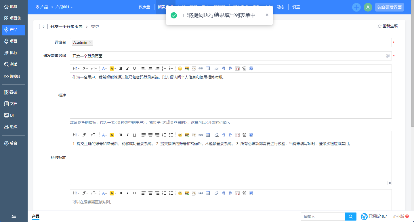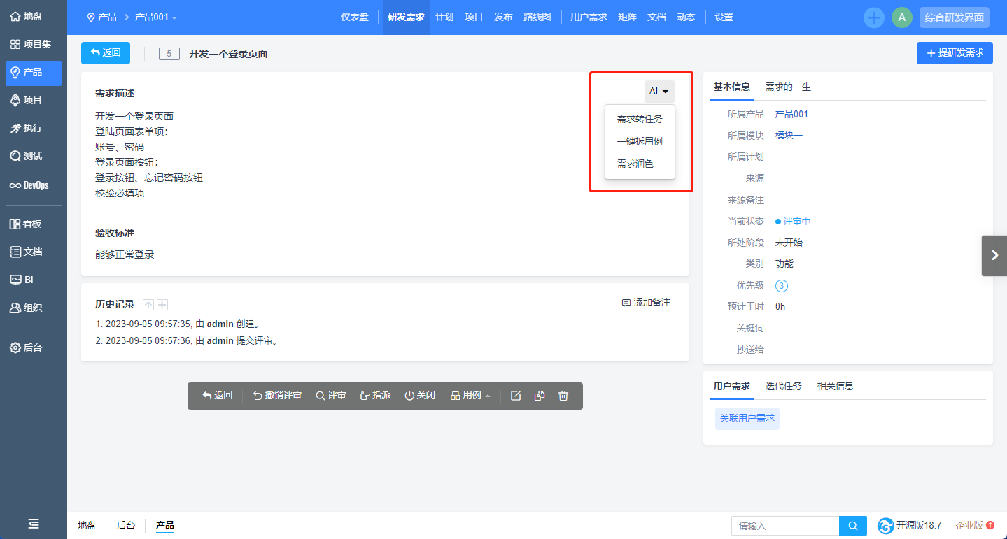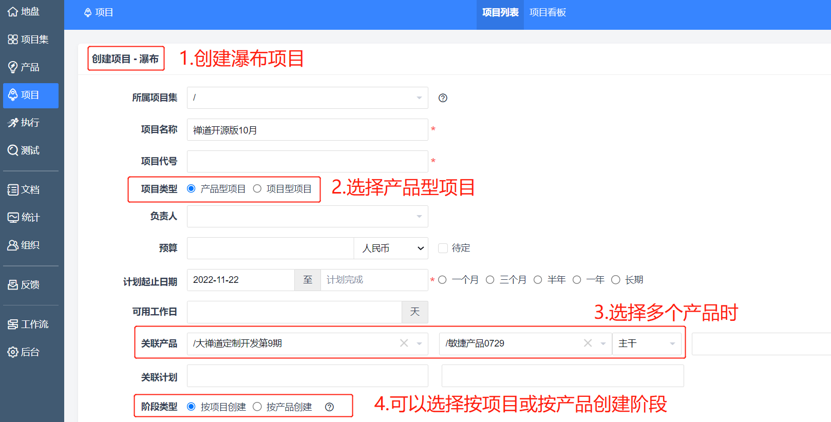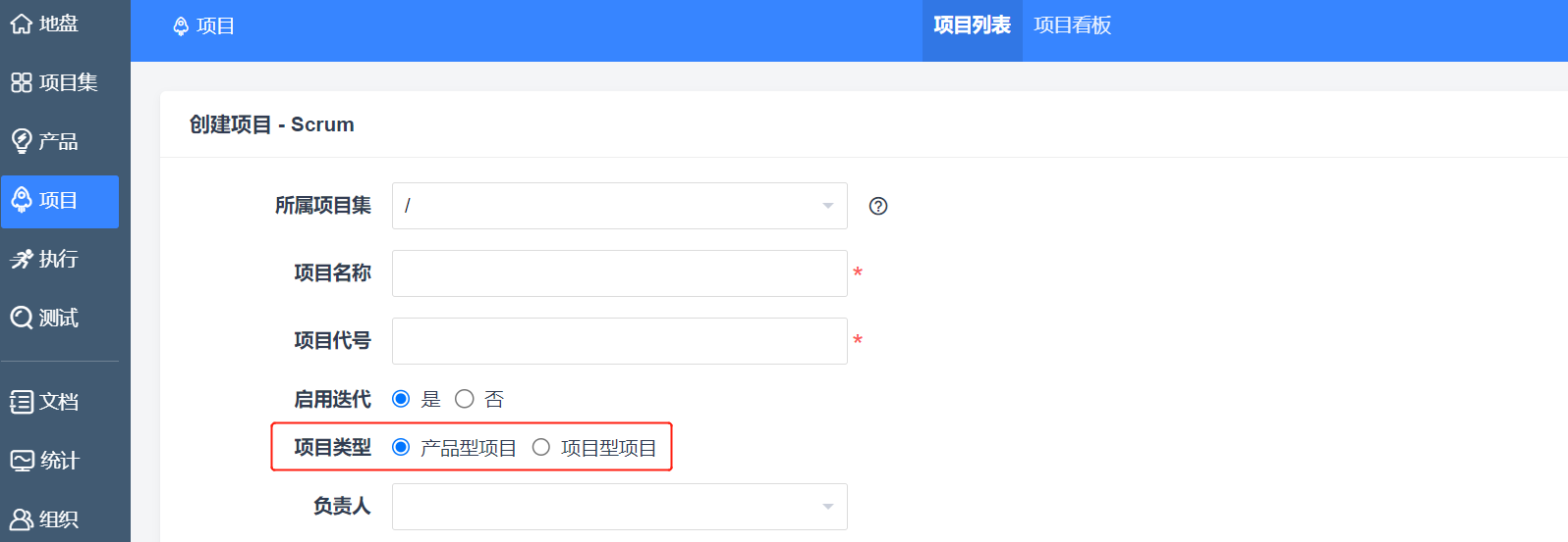 当用户需要管理一个定制化项目时,无需维护产品信息,可以直接在创建项目时选择“项目型项目”,即可在项目中录入需求、分发任务,进行项目管理。