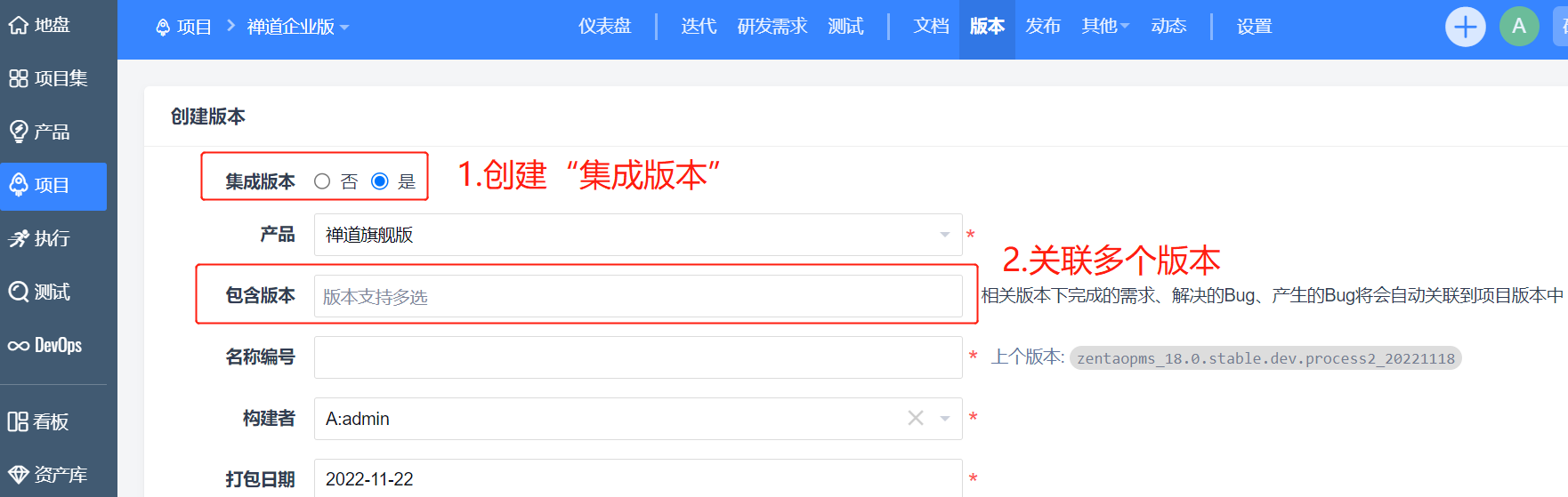 用户可以在项目下创建集成版本,关联多个执行版本。