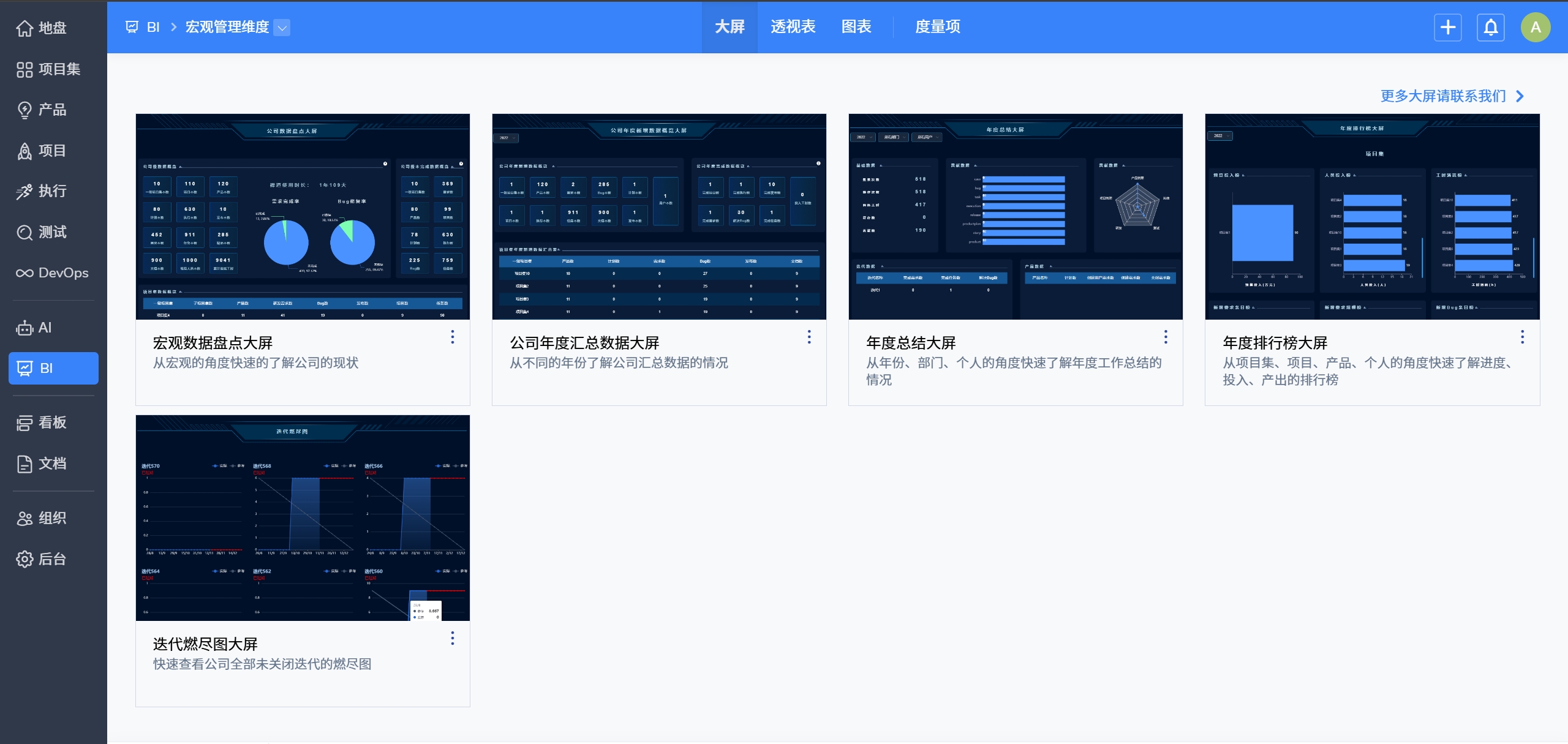 原统计模块升级为BI模块并内置5张宏观管理维度的大屏。BI模块可帮助从宏观的角度快速了解公司现状,内置“公司数据盘点”“公司年度新增数据概览”“年度排行榜”“迭代燃尽图”“年度总结”五张可视化大屏,助力公司高层了解年度情况、助力企业决策。