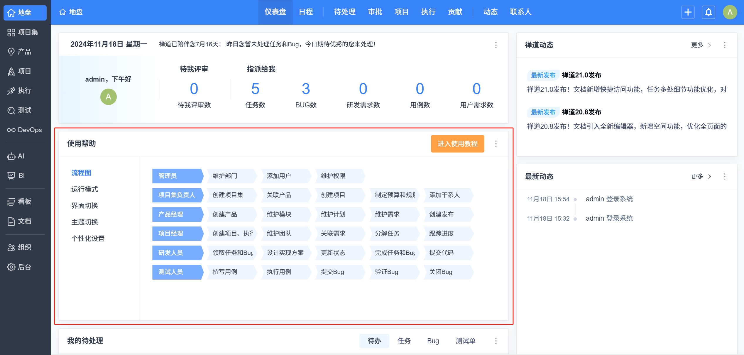 地盘中新增了“使用帮助”区块,可帮助新用户快速上手禅道。