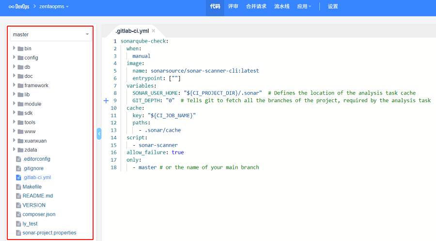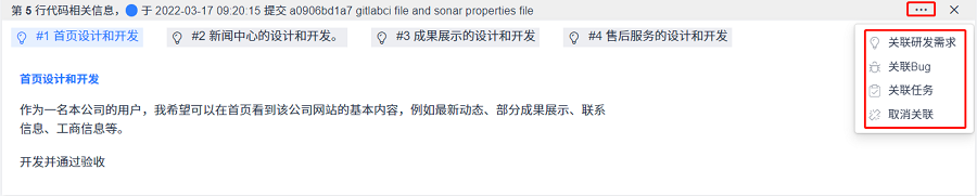 通过文件tab浏览不同文件的代码,展示代码行的提交信息以及关联的禅道工作项信息。