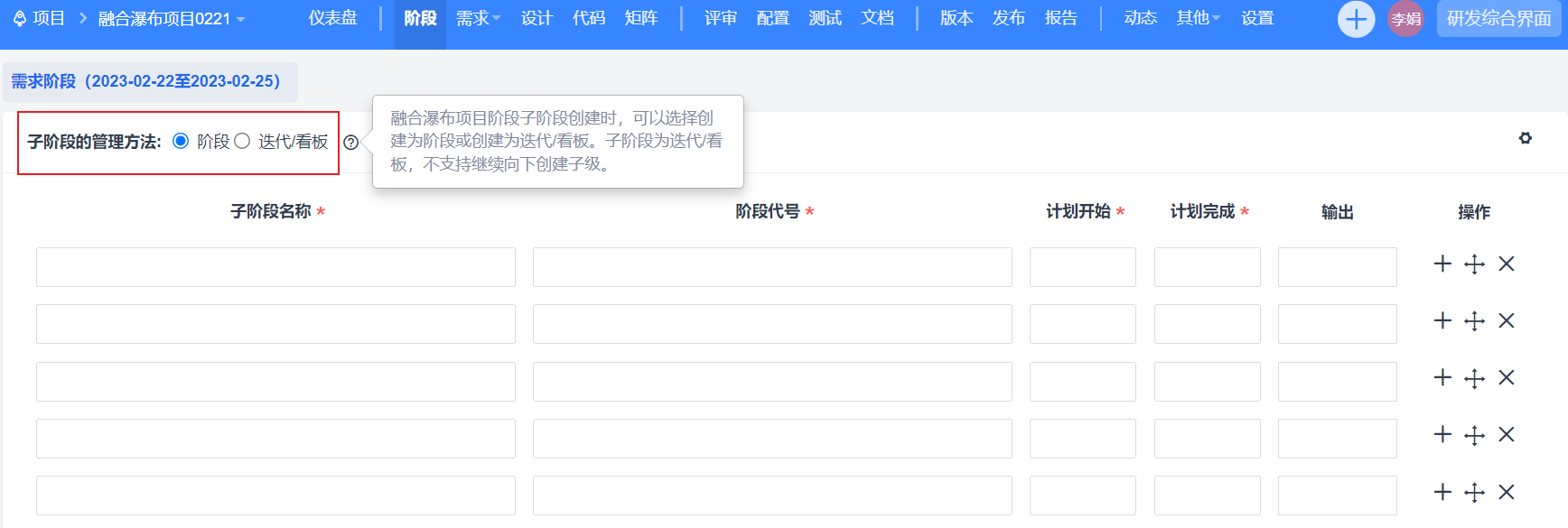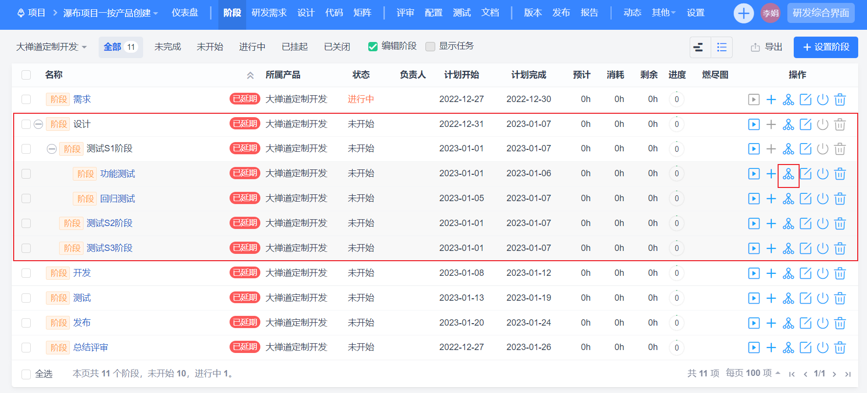 瀑布项目中阶段支持无限级拆分,用户可以维护阶段的父子层级关系,统筹项目安排。