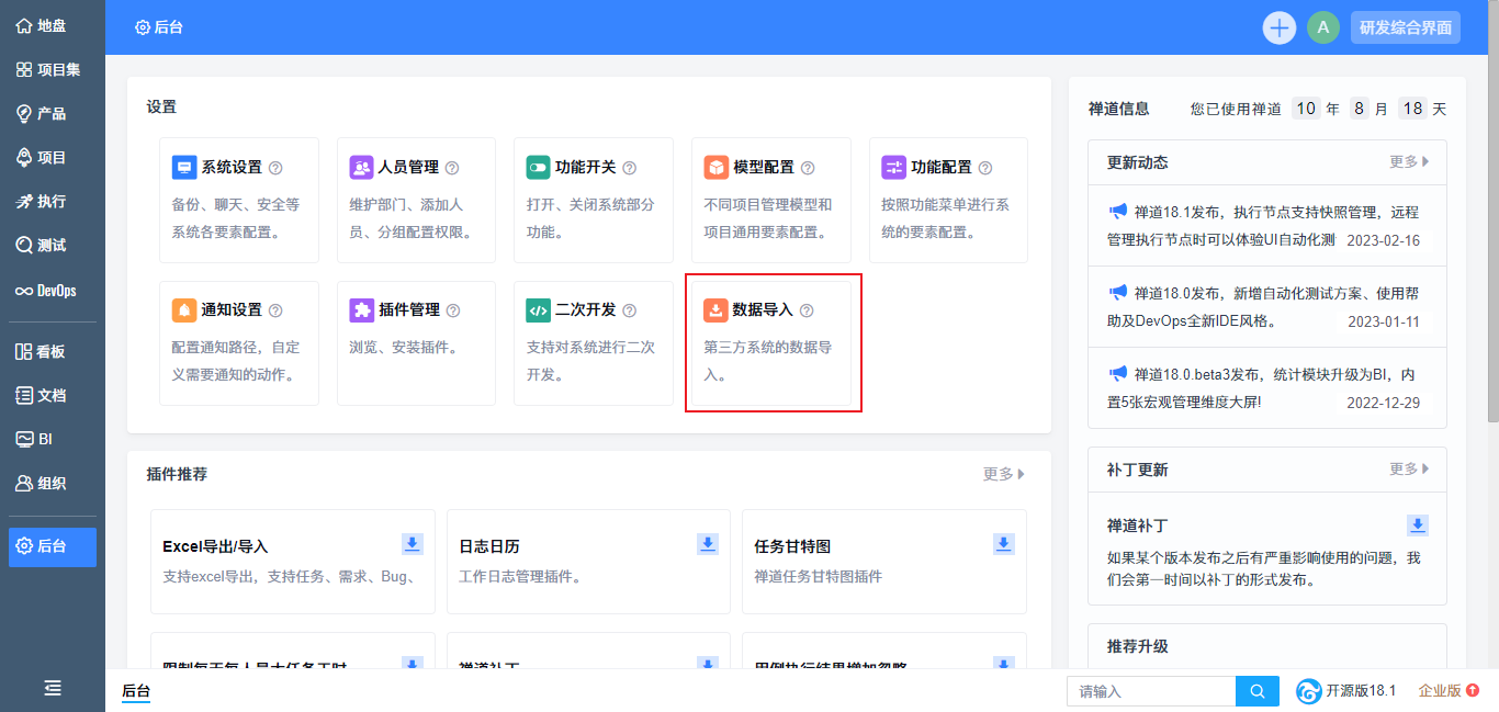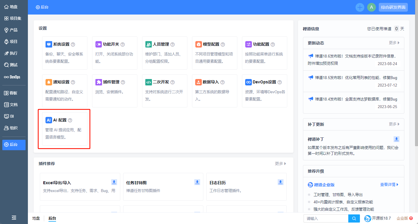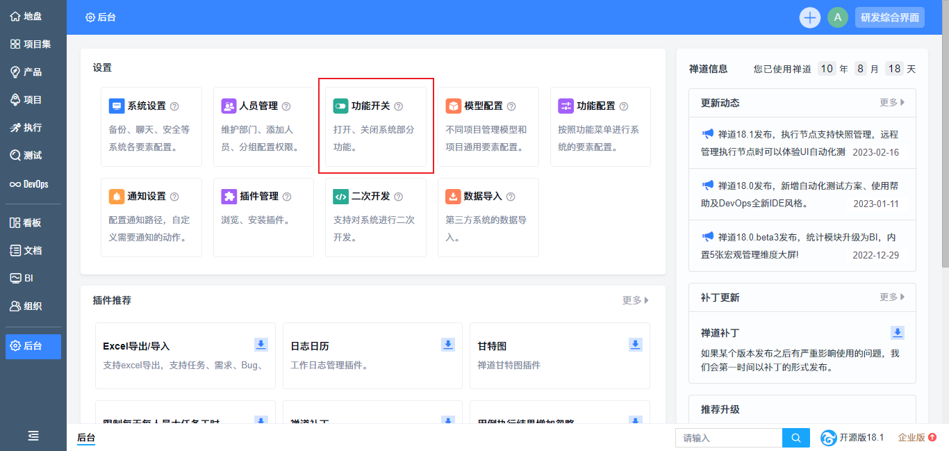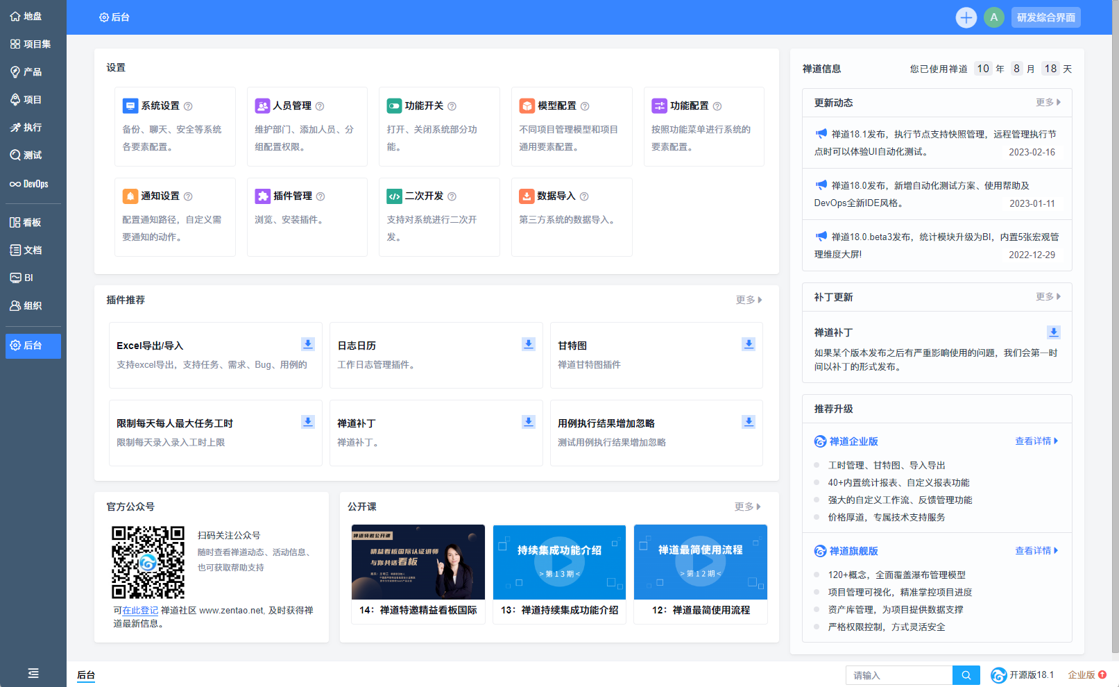 后台首页改版优化,将原后台的一级菜单整合至设置区块;增加禅道信息,您可以随时掌握禅道动态;增加补丁和插件推荐,帮助您了解禅道更多功能,更好使用禅道;增加公众号和公开课信息,助力您快速上手禅道;此外还增加了禅道企业版和旗舰版的介绍,您可以了解禅道更完善的功能。