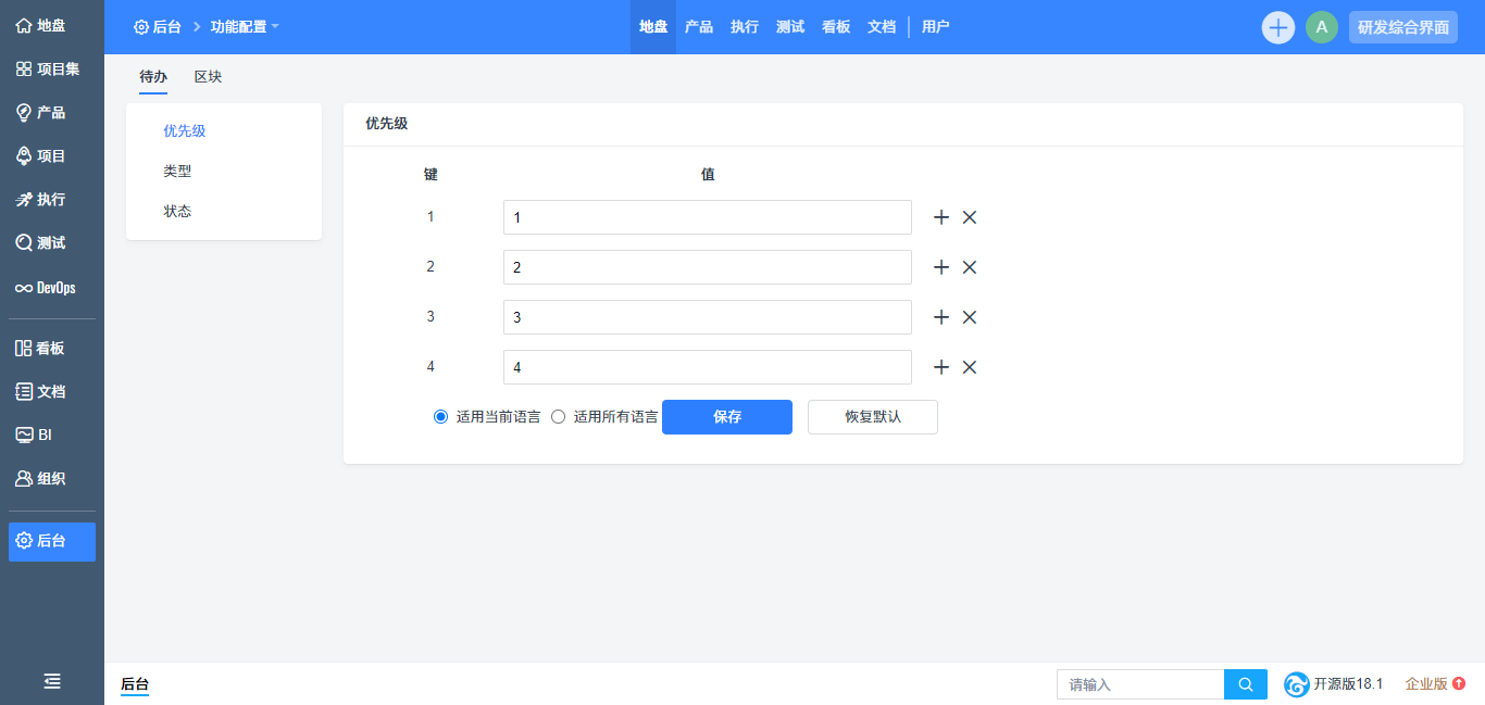 后台二次开发增加语言项,支持公共语言自定义,公共语言项自定义后,系统该语言项会同步更改;支持一、二、三级菜单的语言项自定义,自定义后对应的导航会同步更改;支持列表检索标签的自定义,修改后该列表检索标签会调整。您可以根据所在行业,根据不同的场景定义禅道的语言项,让禅道和您的使用场景更加匹配。