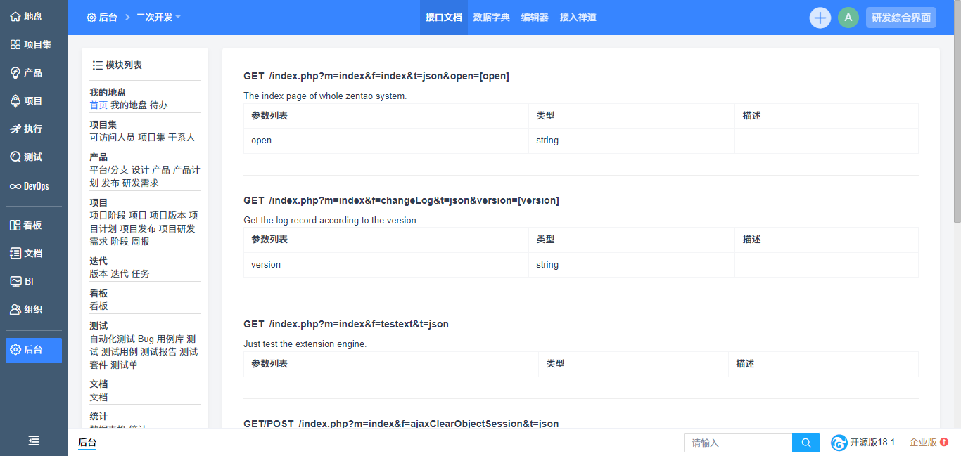 将二次开发中的“API”语言项修改为“接口文档”,将“数据库”语言项改为“数据字典”,将“应用”语言项改为“接入禅道",方便您理解。