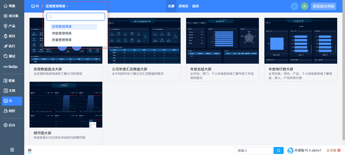 通过维度导航切换至不同的维度内,内置宏观管理维度、效能管理维度、质量管理维度。